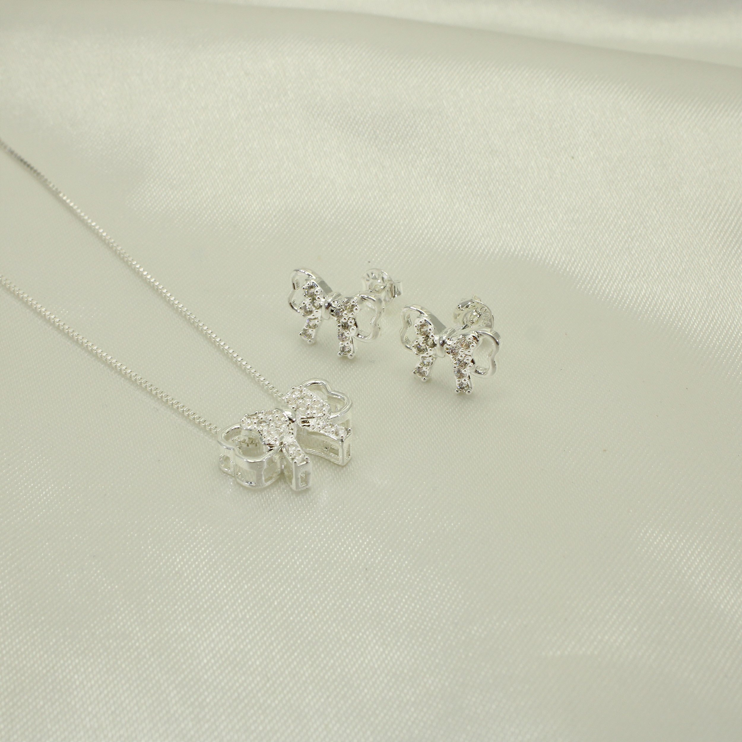 Conjunto de Laço Cravejado em Zircônia Cristal e Banhado a Prata