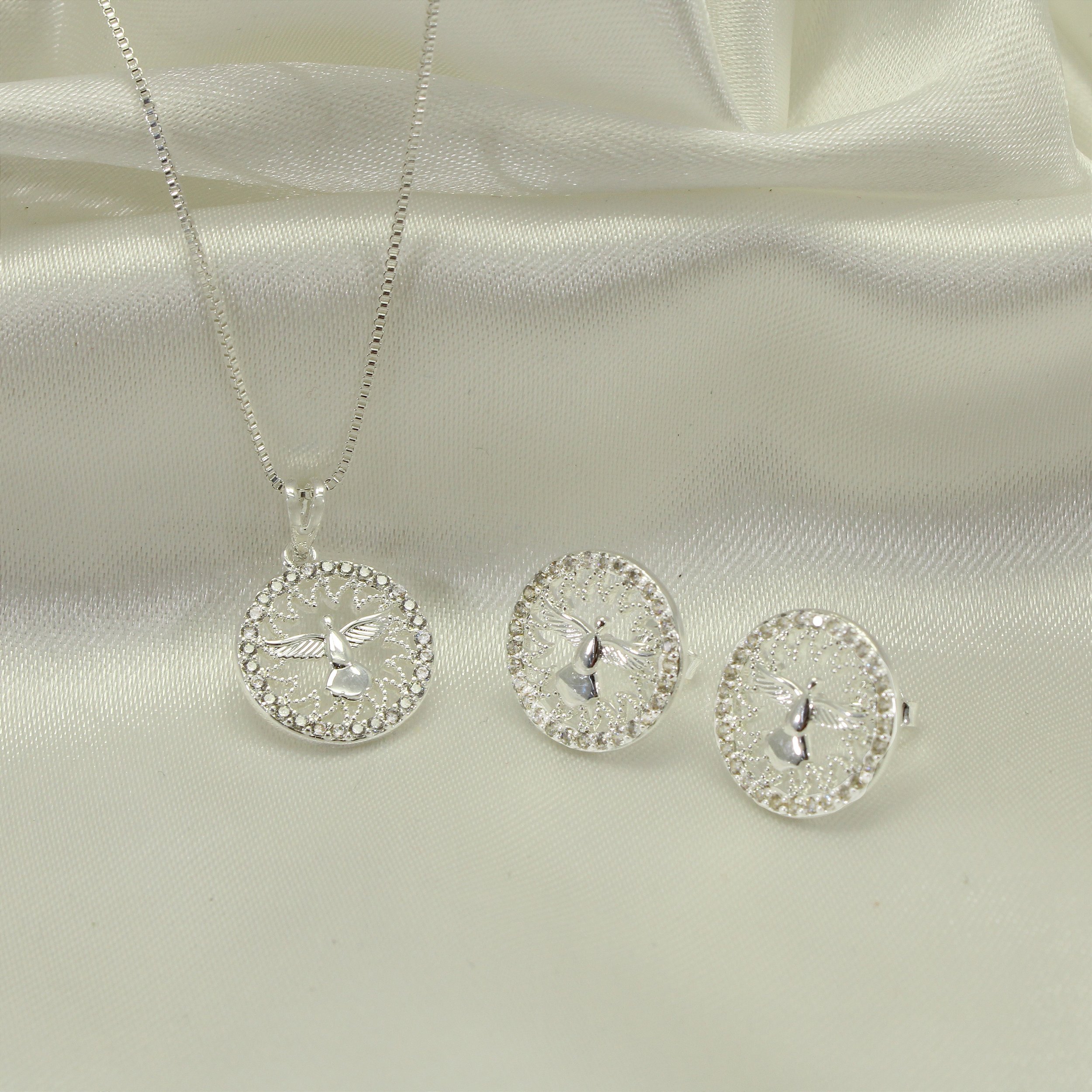 Conjunto Divino Espírito Santo com Zircônia Cristal Banhado a Prata
