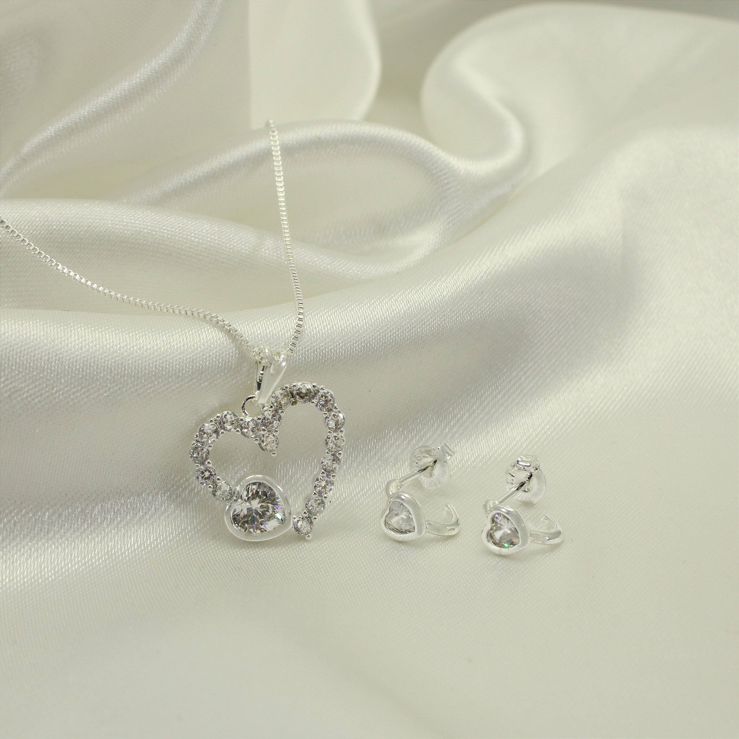 Conjunto de Coração com Zircônia Cristal Banhado a Prata