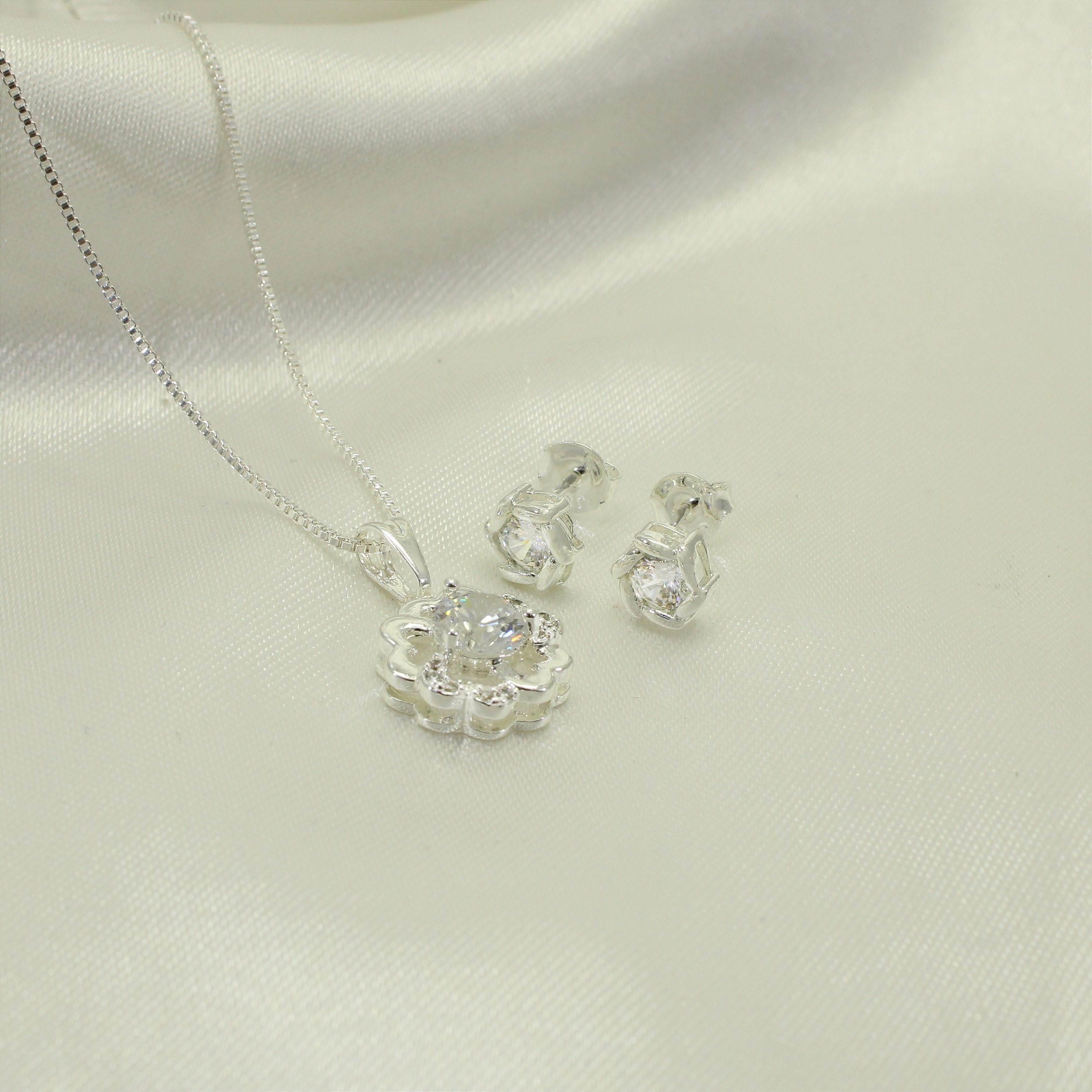 Conjunto de Flor com Zircônia Cristal Banhado a Prata