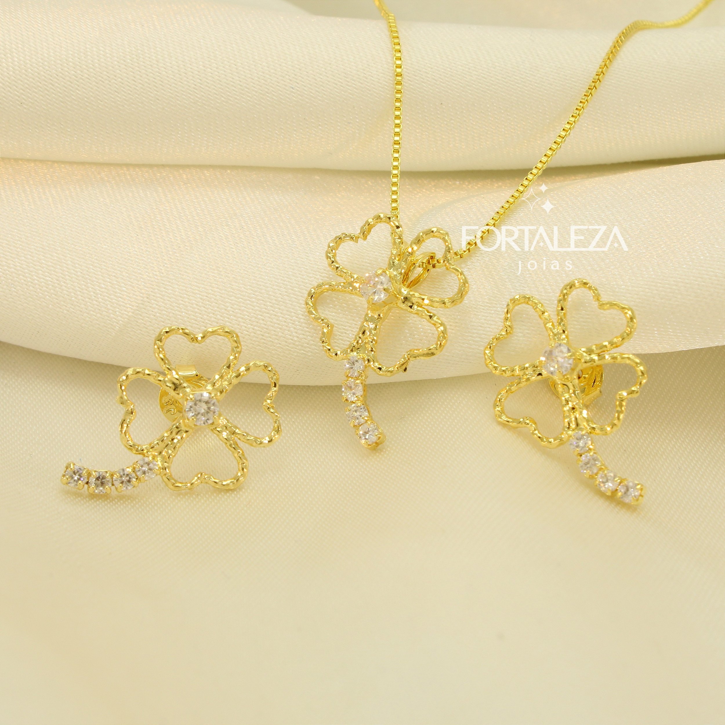 Conjunto de Trevo com Detalhe em Zircônia Cristal Banhado a Ouro 18k