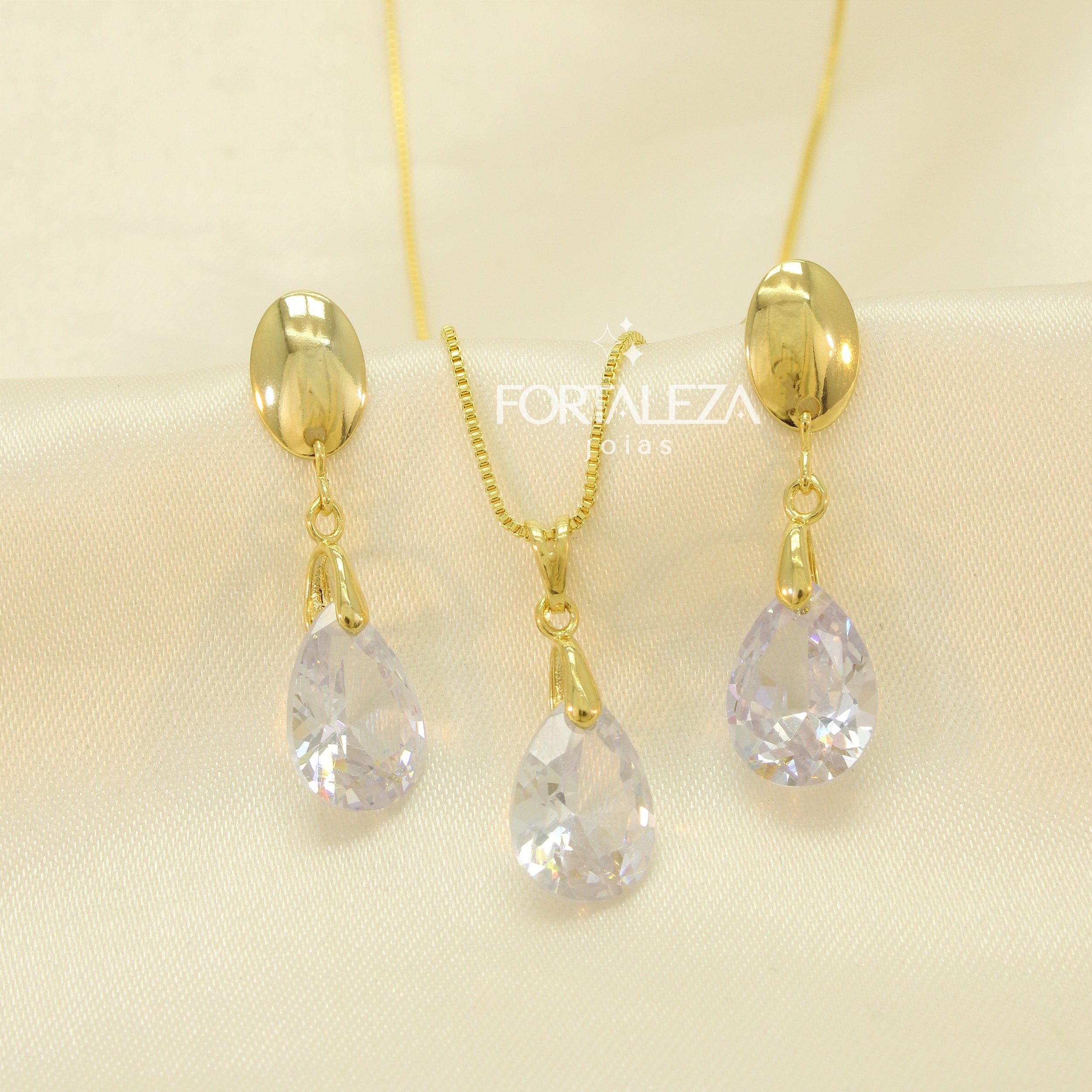 Conjunto Gota de Zircônia Cristal Banhado a Ouro 18k