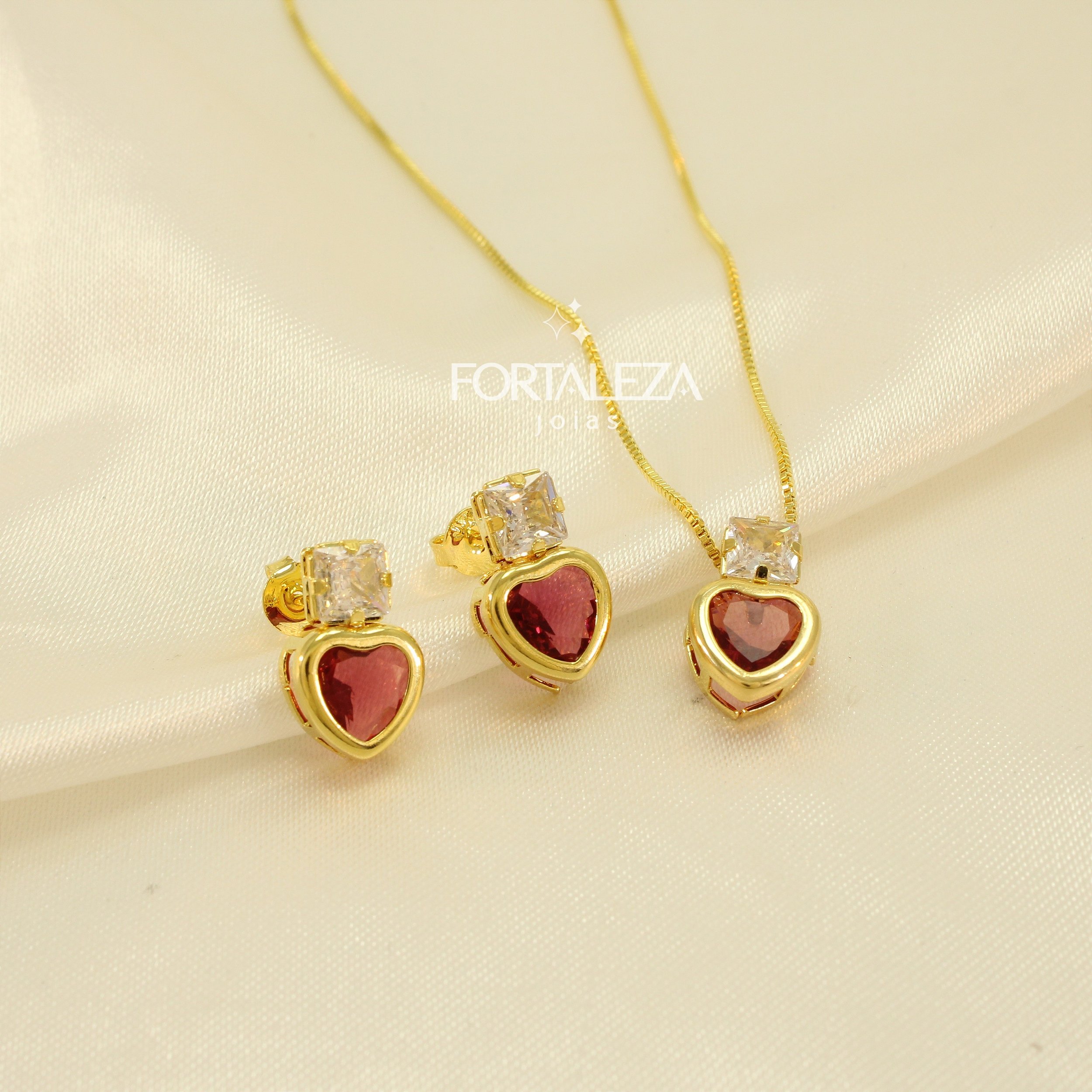 Conjunto de Coração com Zircônias Banhado a Ouro 18k