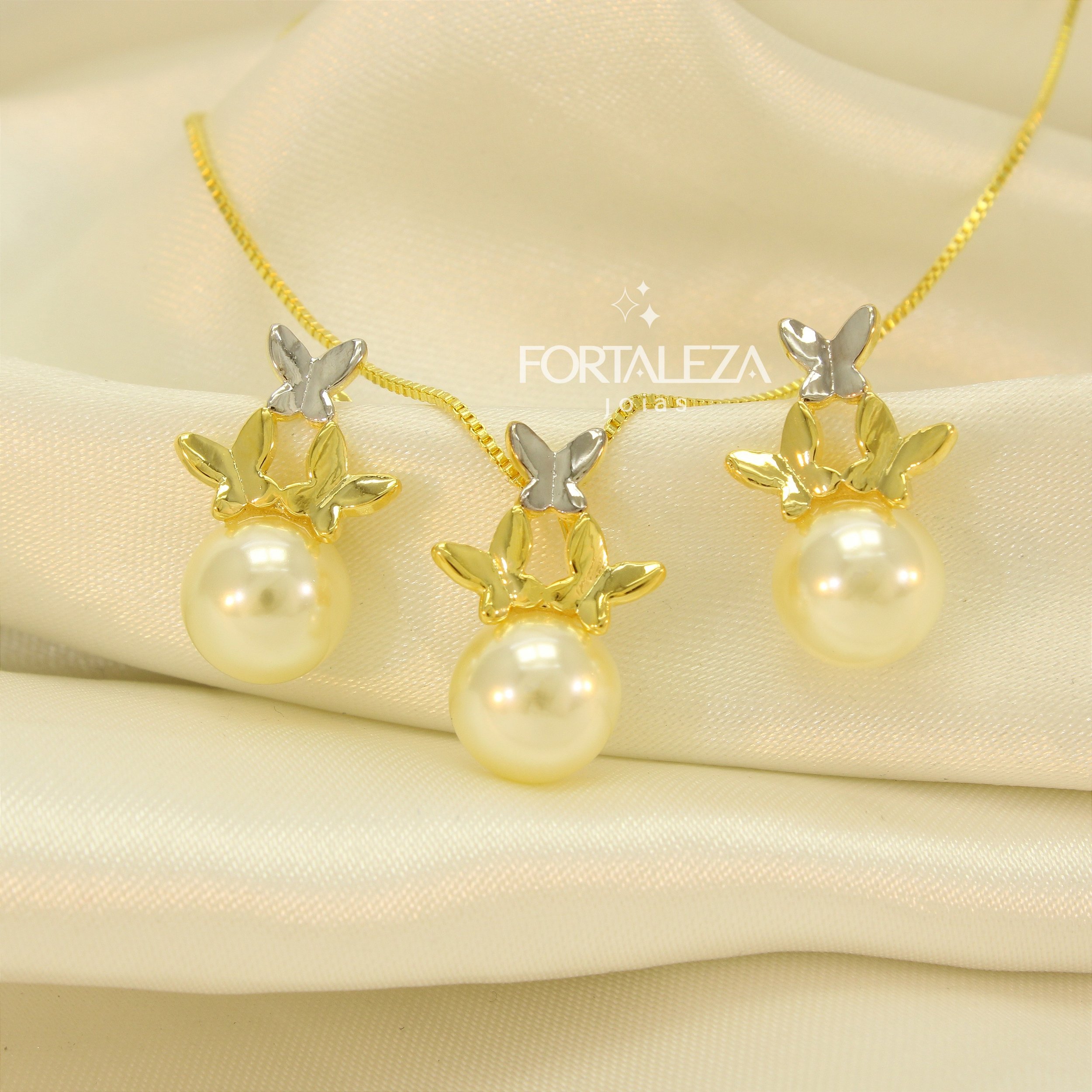 Conjunto de Pérola com Borboletas Banhado a Ouro 18k e Ródio
