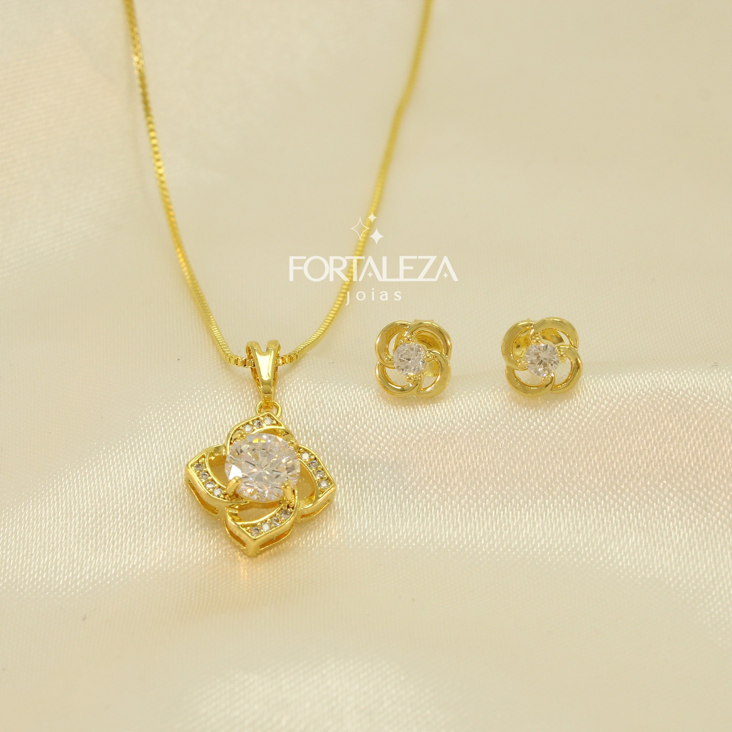 Conjunto de Flor com Zircônia Cristal Banhado a Ouro 18k