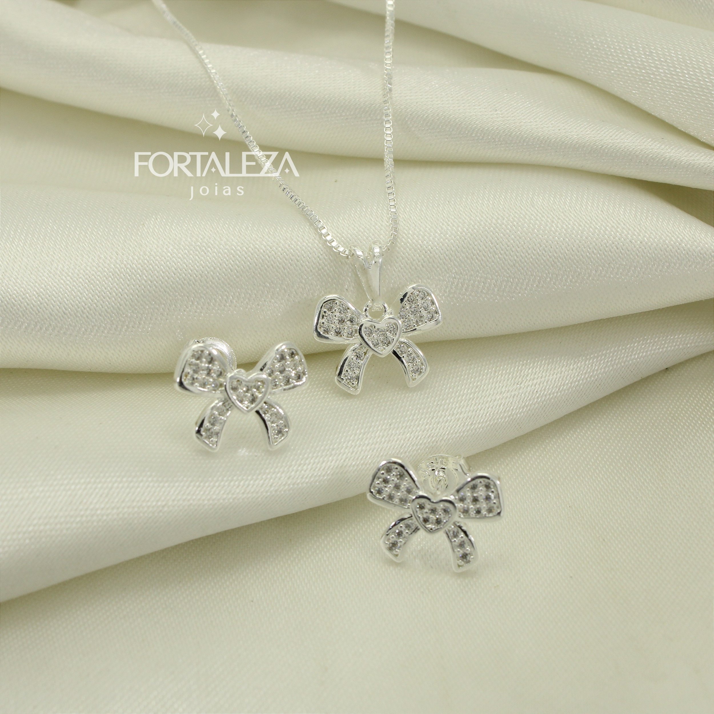 Conjunto de Laço Cravejado em Zircônia Banhado a Prata