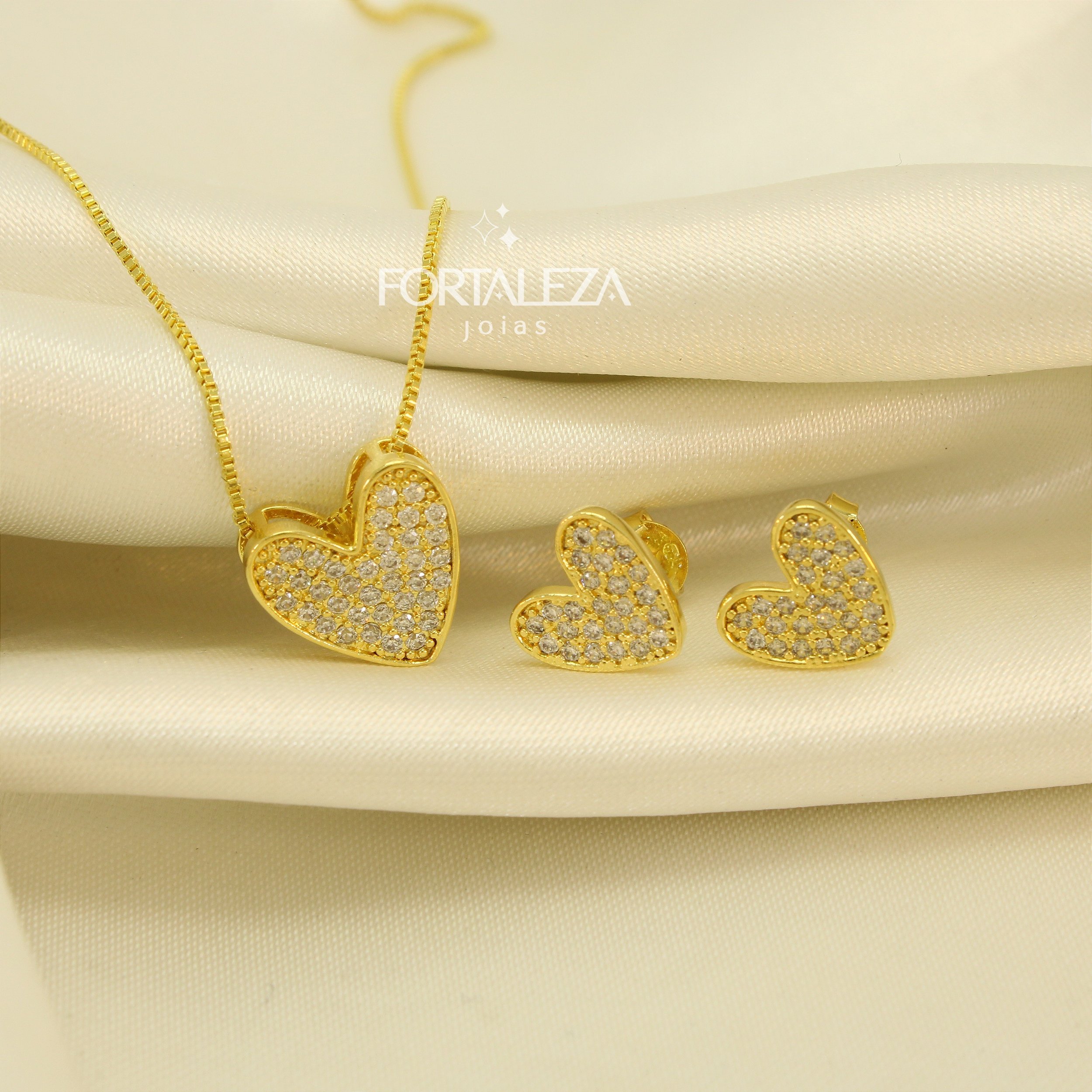 Conjunto de Coração Cravejado em Zircônia Cristal Banhado a Ouro 18k
