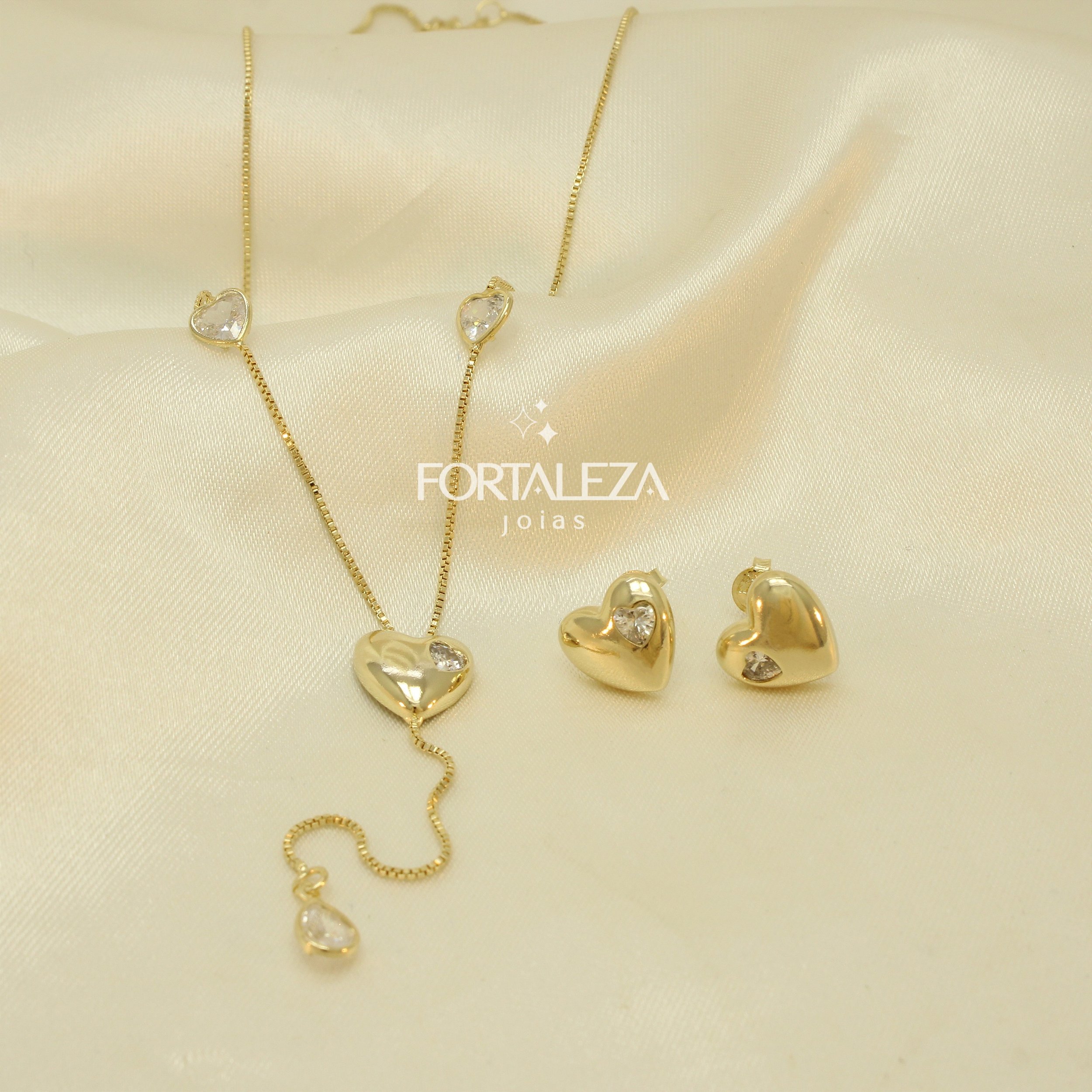 Conjunto de Coração com Design Gravatinha e Detalhe em Zircônia Cristal Banhado a Ouro 18k