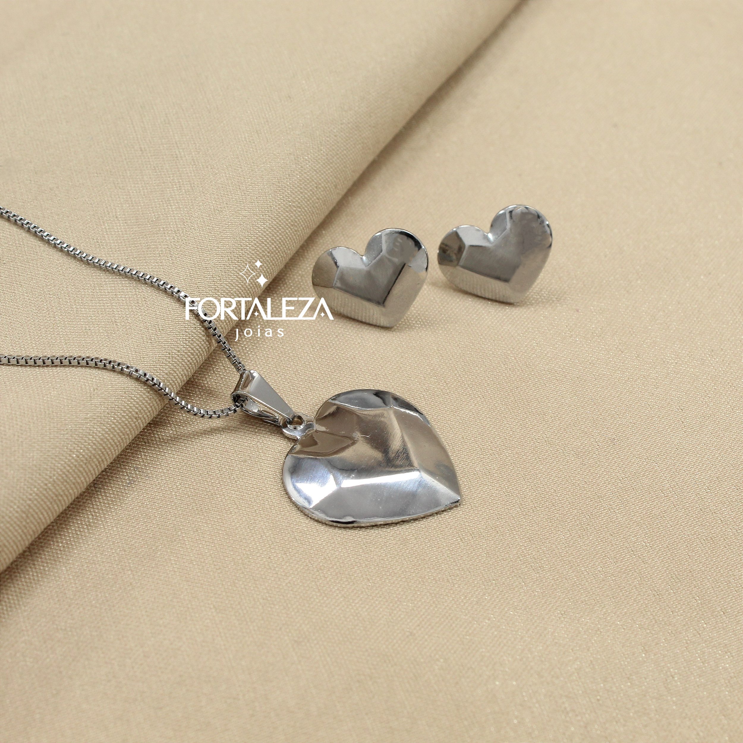 Conjunto Coração Facetado Banhado a Ouro Branco