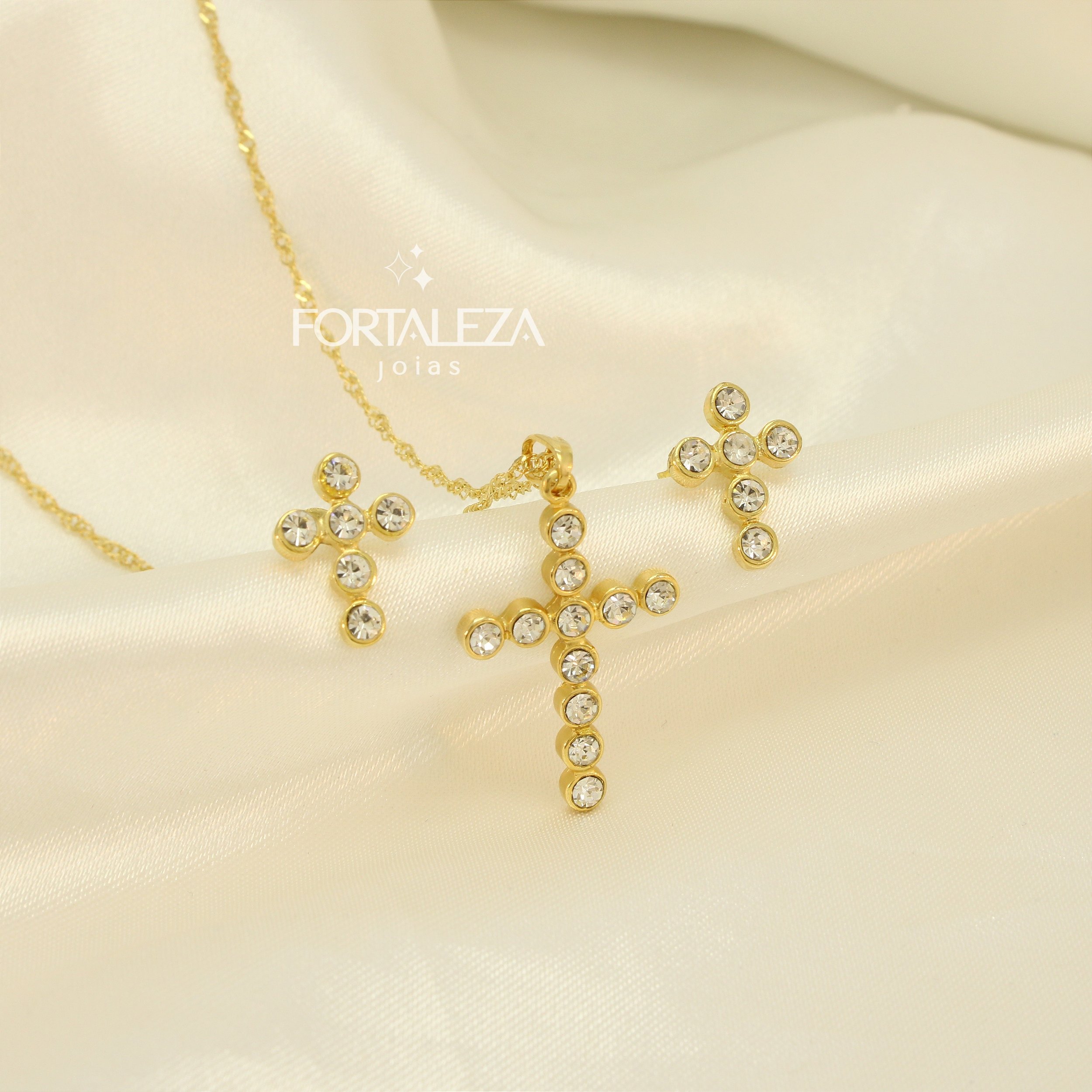 Conjunto de Cruz Cravejado em Zircônia Cristal Banhado a Ouro 18k