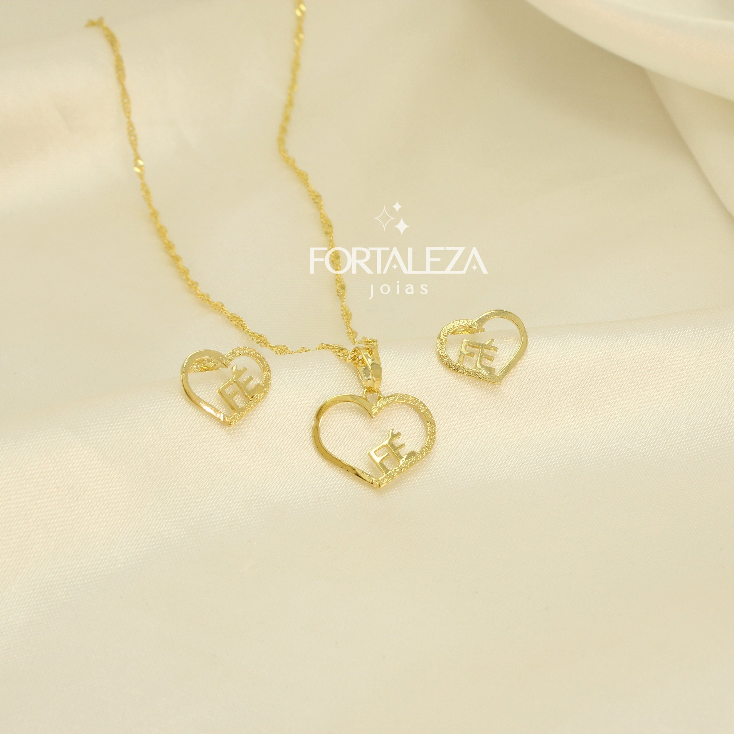 Conjunto de Coração Escrito Fé Banhado a Ouro 18k