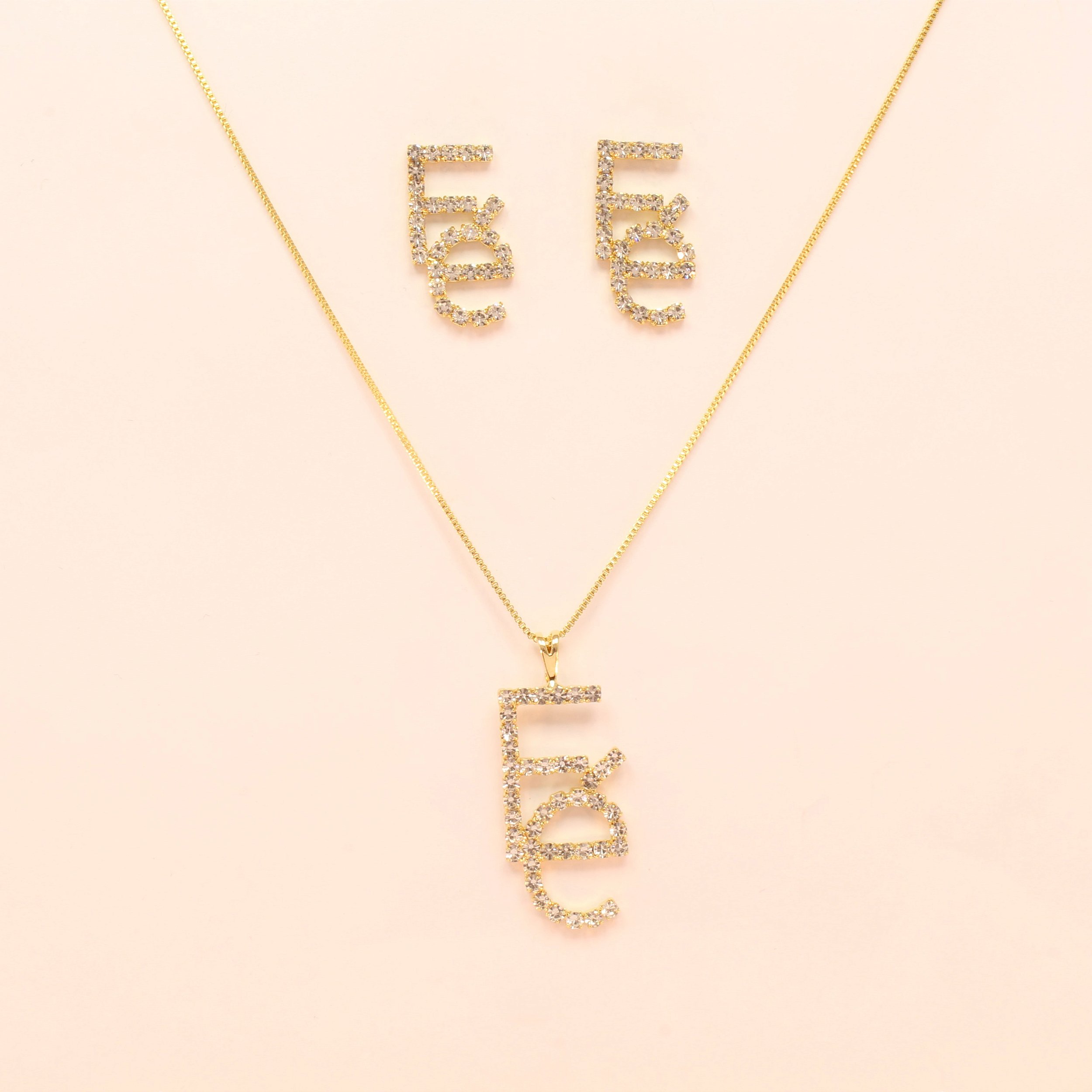 Conjunto Fé Cravejado em Zircônias Cristal Folheado a Ouro 18k