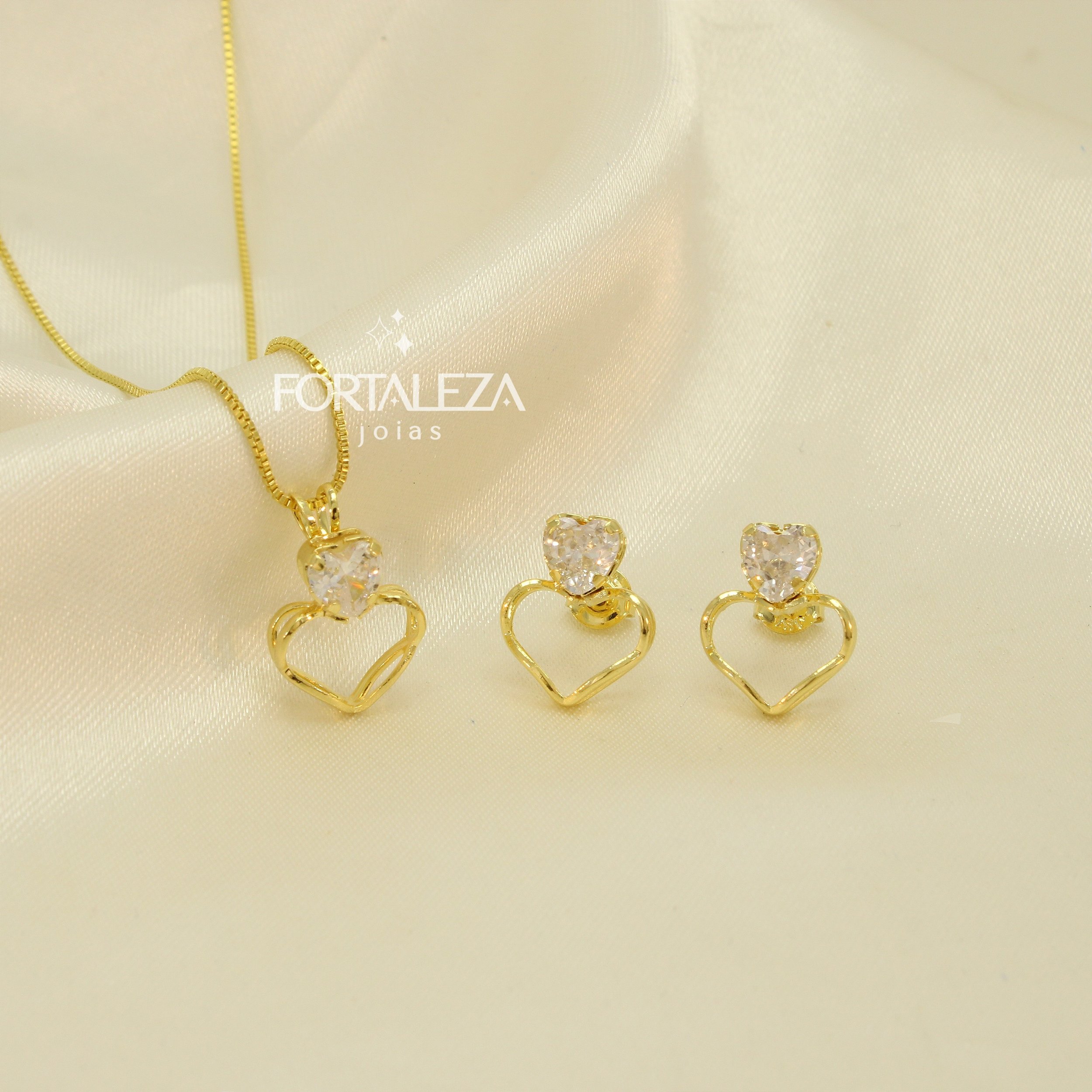 Conjunto Dois Corações e Zircônia Cristal Banhado a Ouro 18k