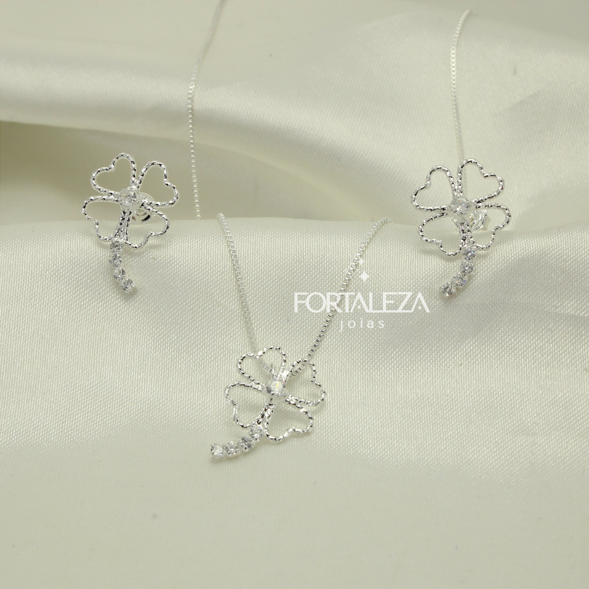 Conjunto Trevo Vazado com Zircônia Cristal Banhado a Prata
