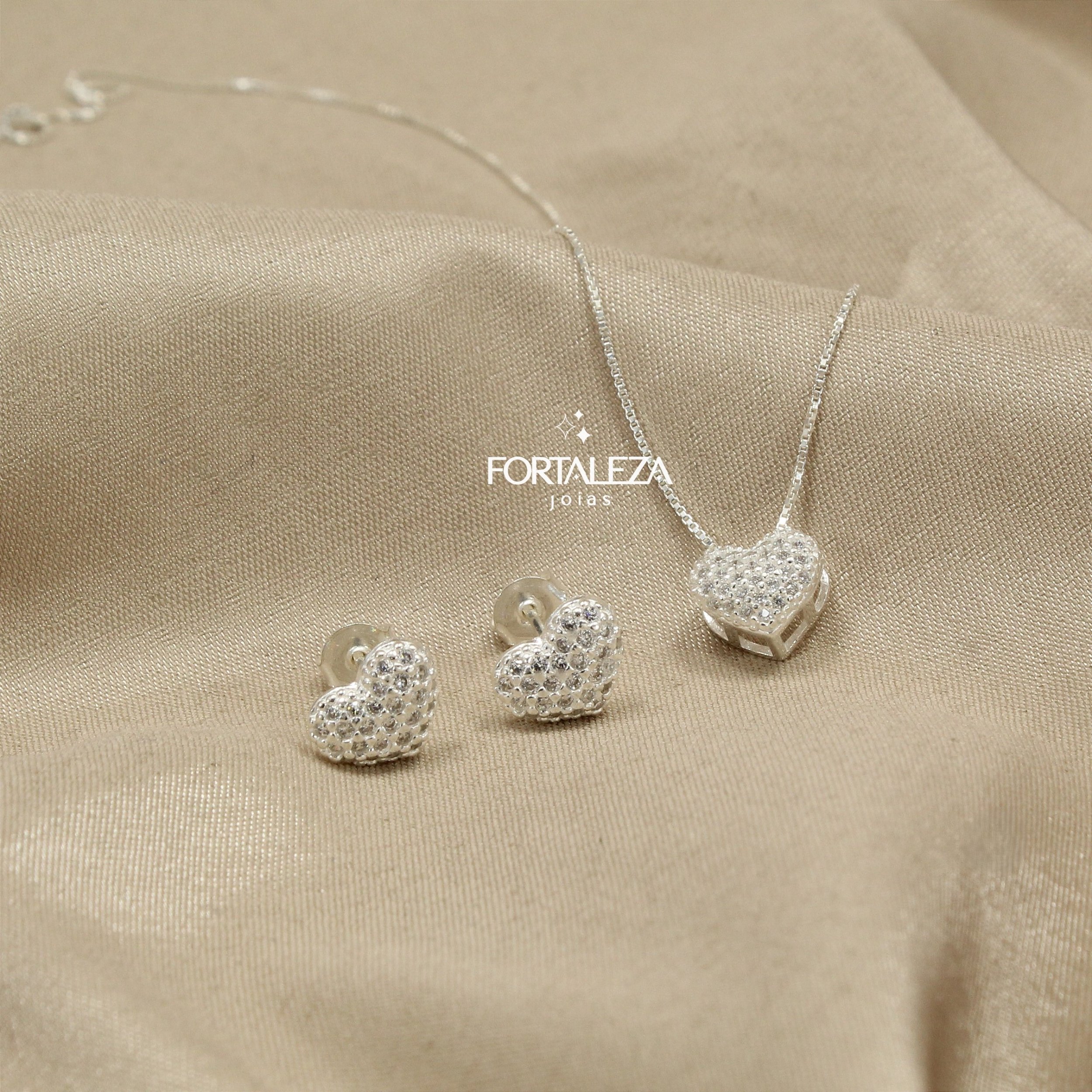 Conjunto de Coração Cravejado com Zircônia Cristal em Prata 925