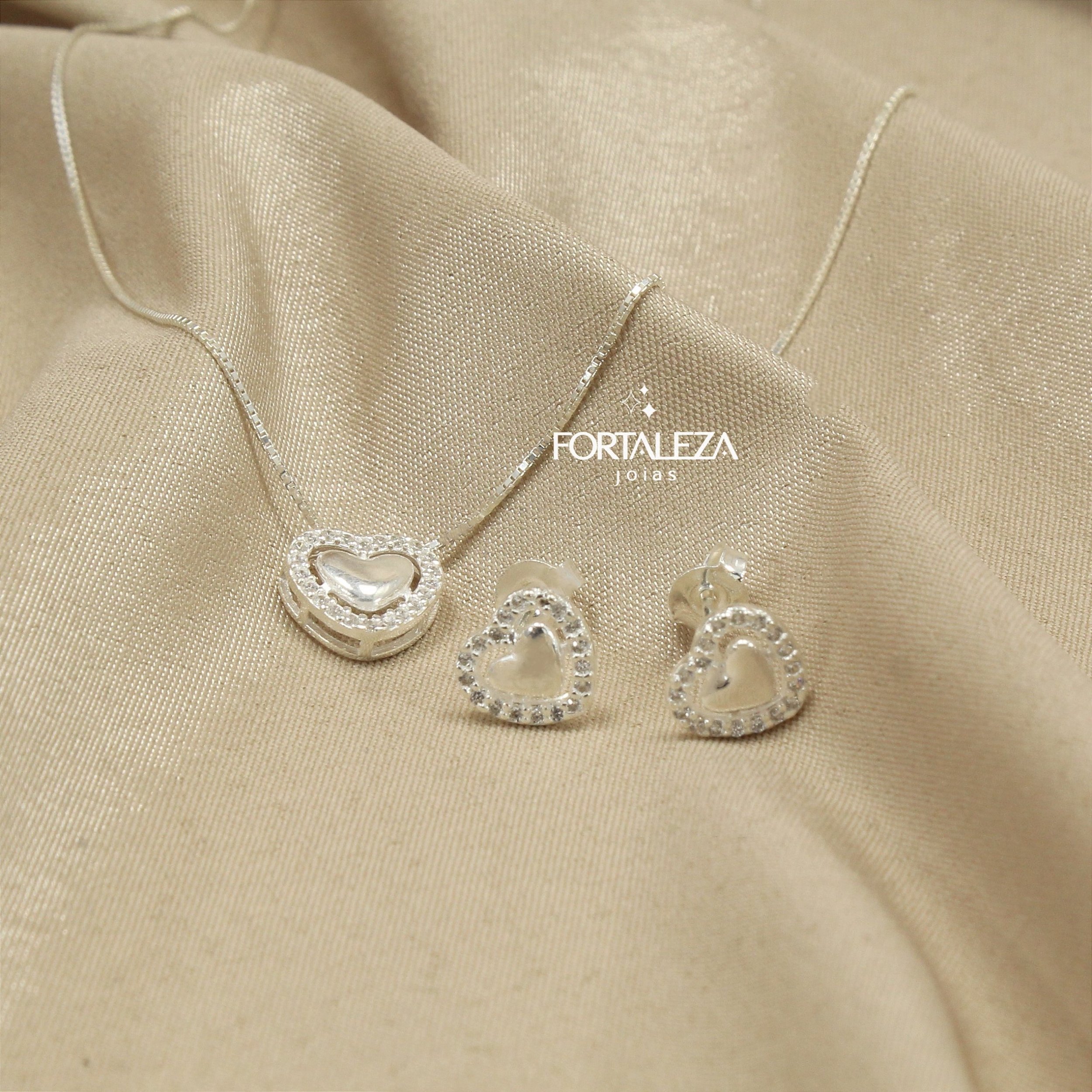 Conjunto de Coração com Zircônia Cristal em Prata 925