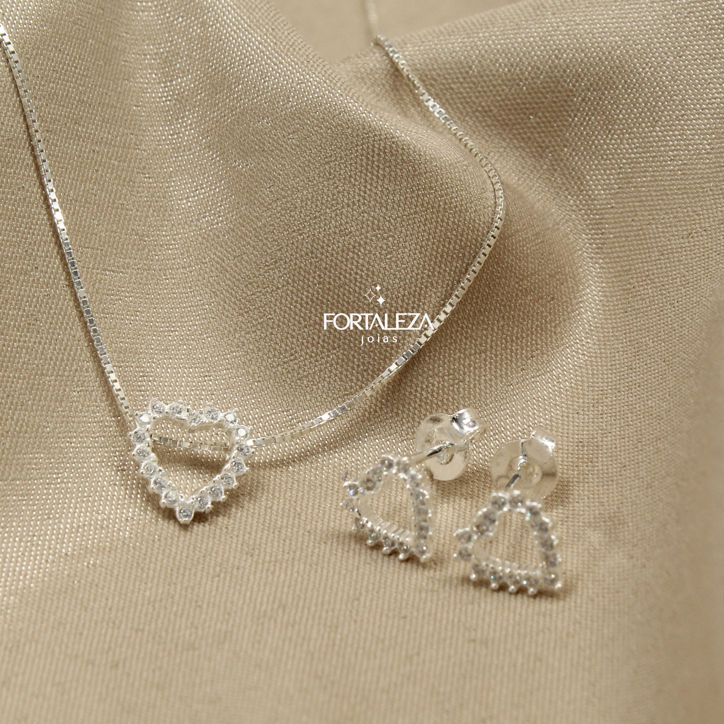 Conjunto Coração Cravejado com Zircônia Cristal em Prata 925