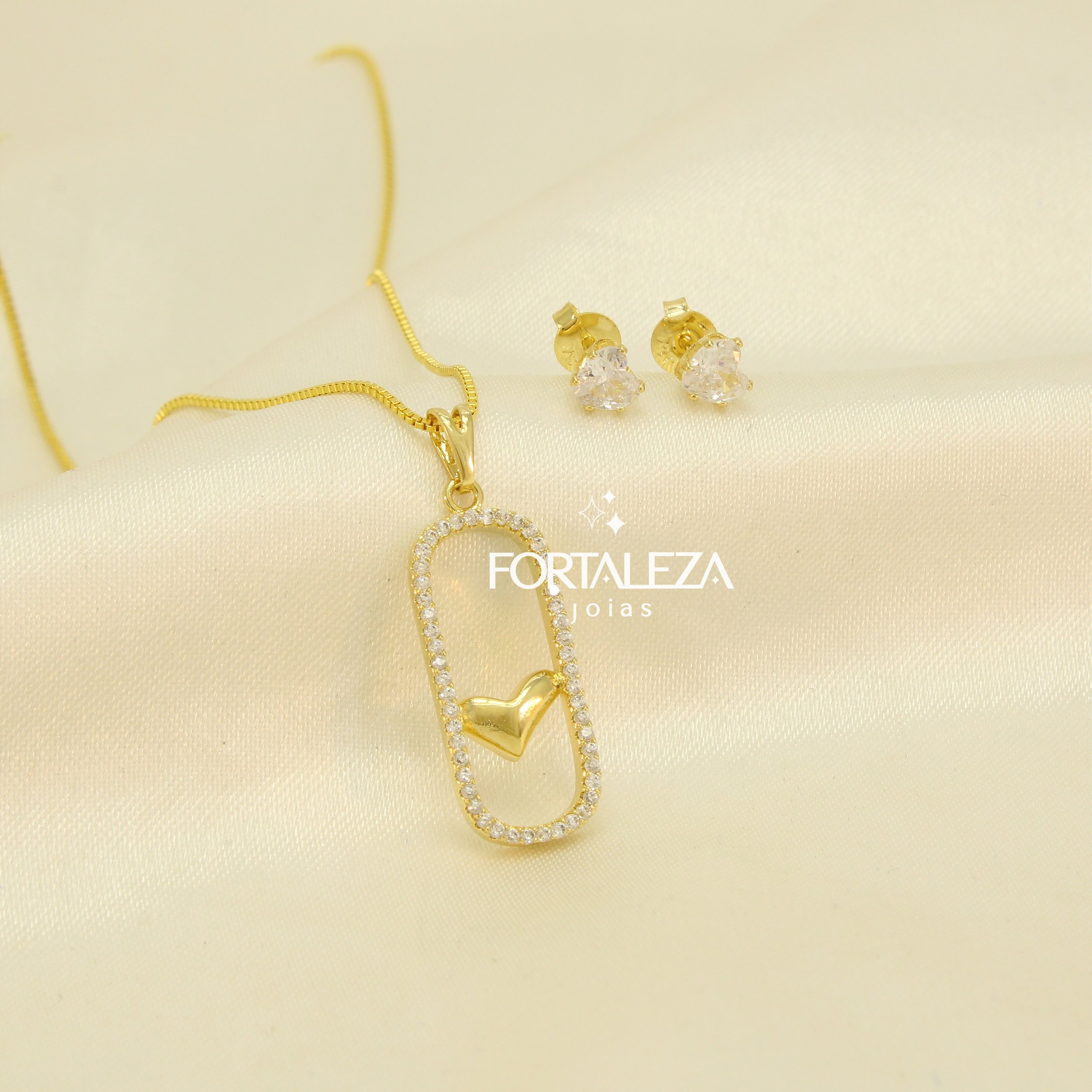 Conjunto Coração com Detalhes em Zircônia Banhado a Ouro 18k