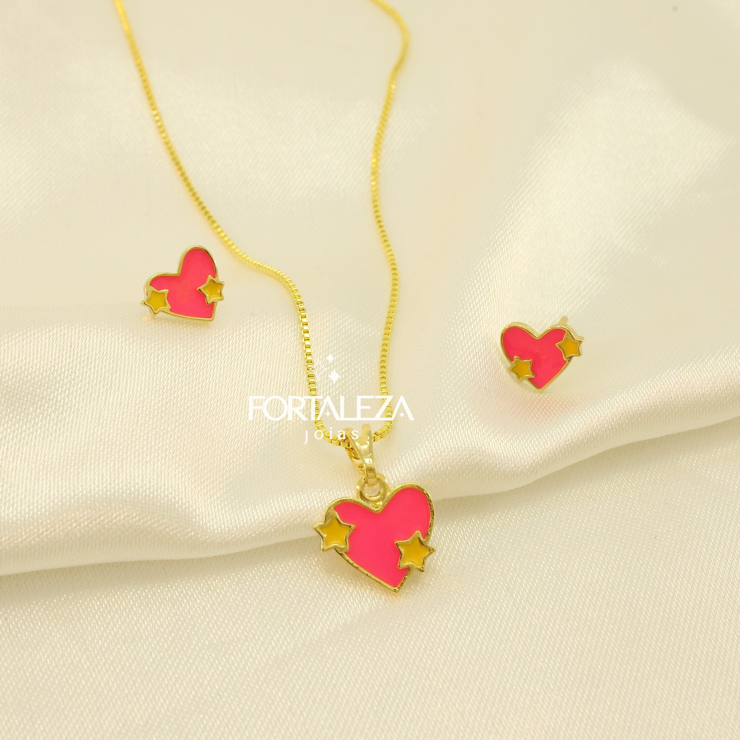 Conjunto Coração Resinado Banhado a Ouro 18k