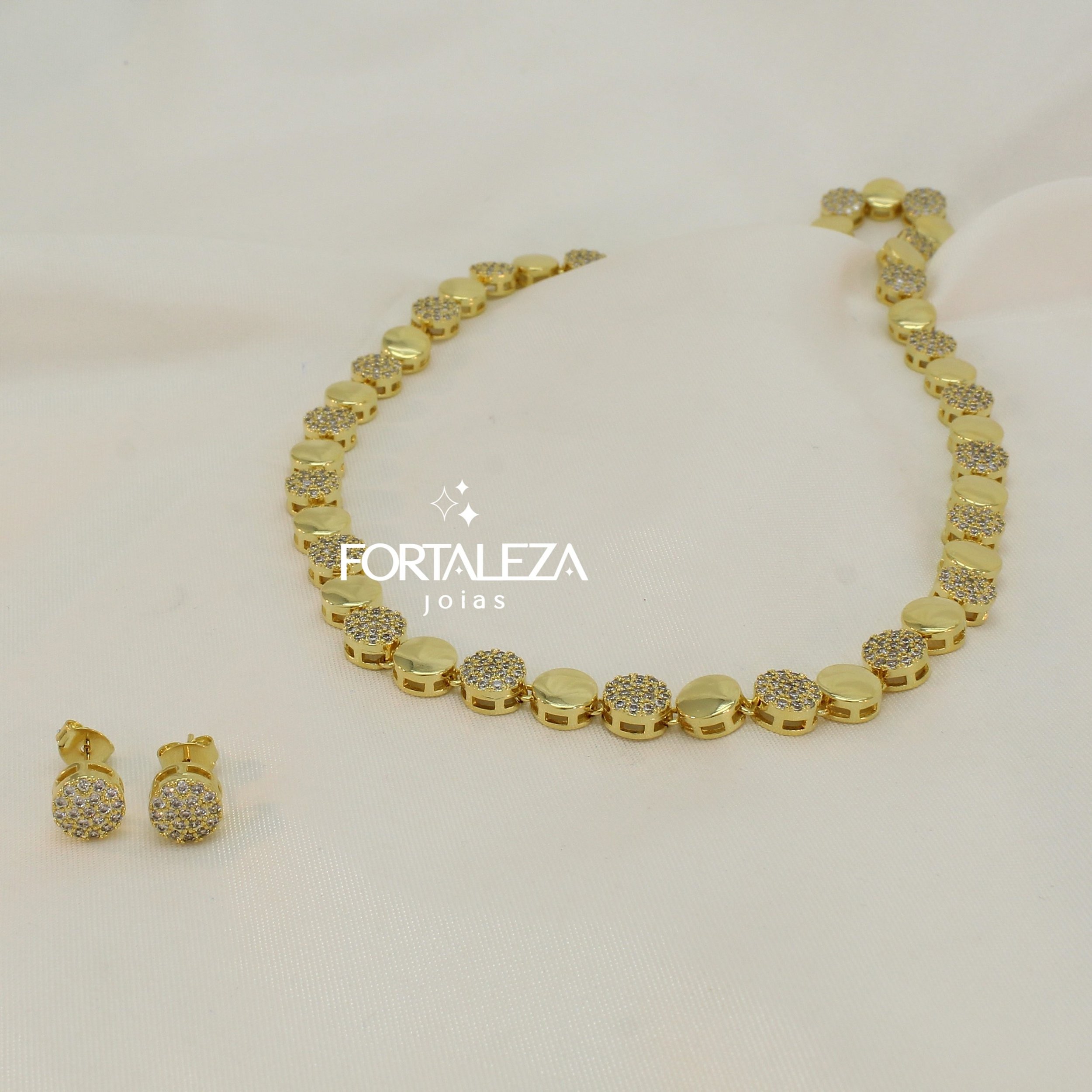 Conjunto com Design de Bola Polida e Cravejada em Zircônia Cristal Banhado a Ouro 18k