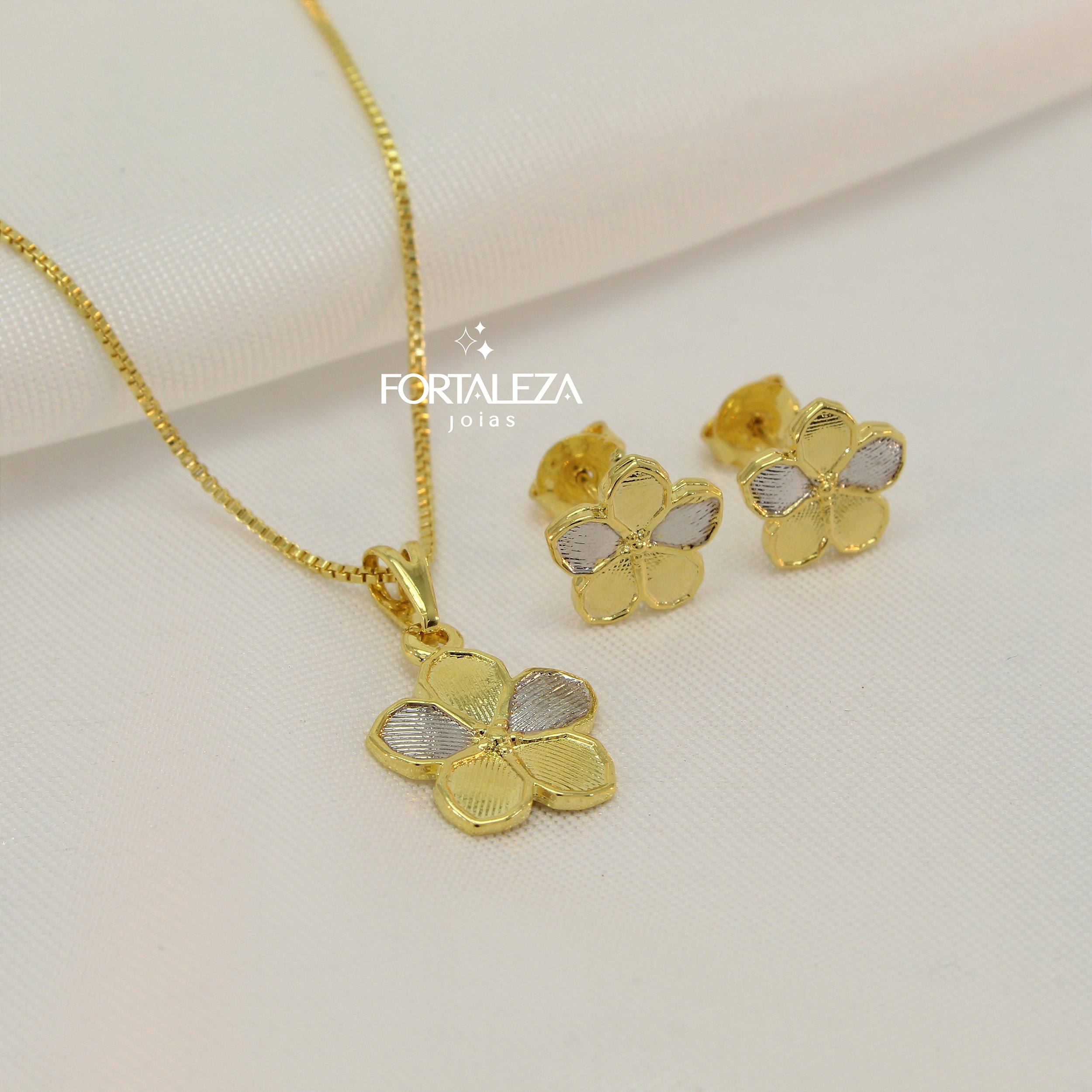 Conjunto de Flor Texturizada Banhado a Ouro 18k e Ródio