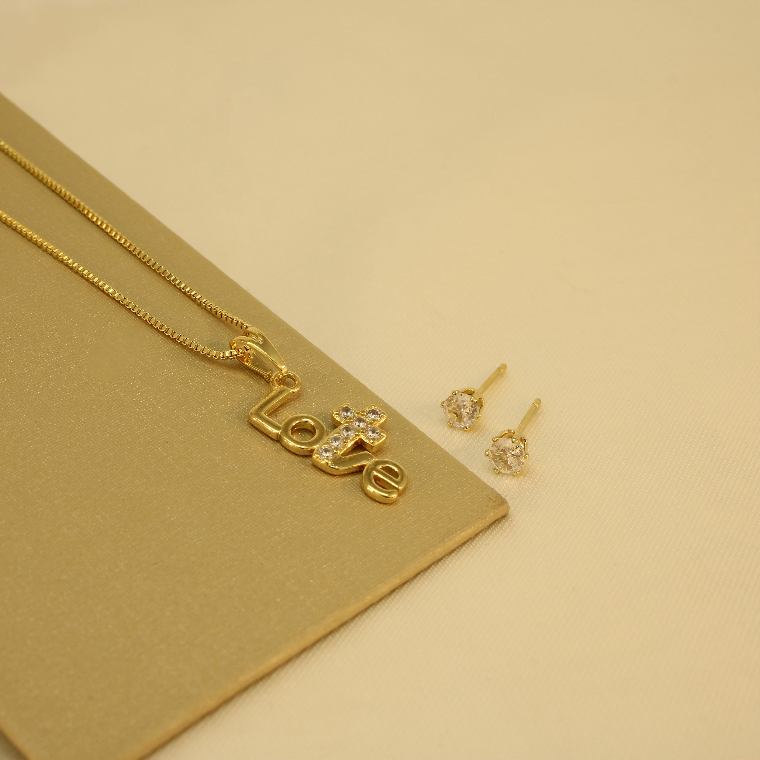 Conjunto Escrito Love e Cruz Cravejada em Zircônia Cristal Banhado a Ouro 18k