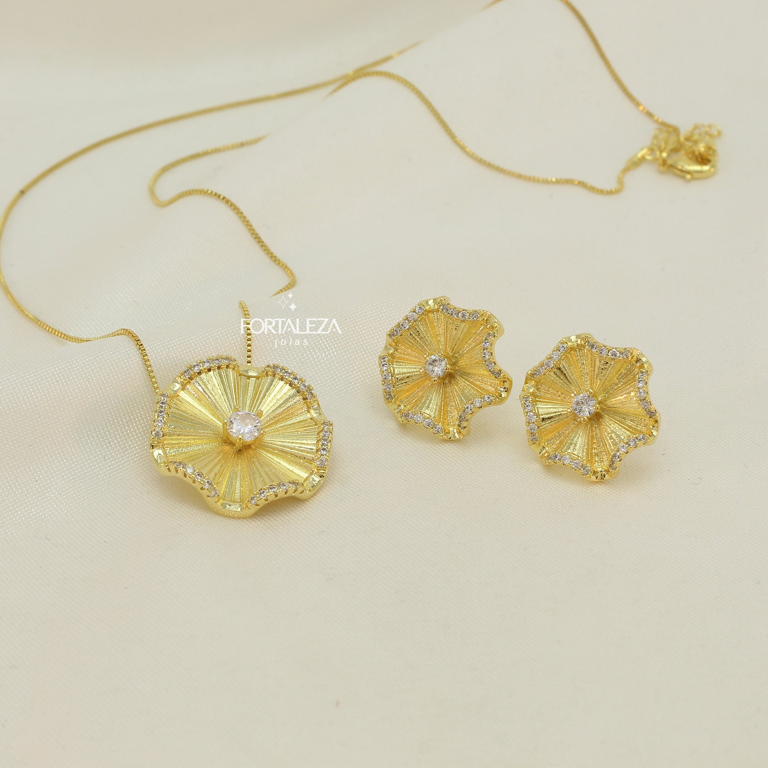 Conjunto de Flores com Bordas de Zircônia em Cristal Banhado a Ouro 18k