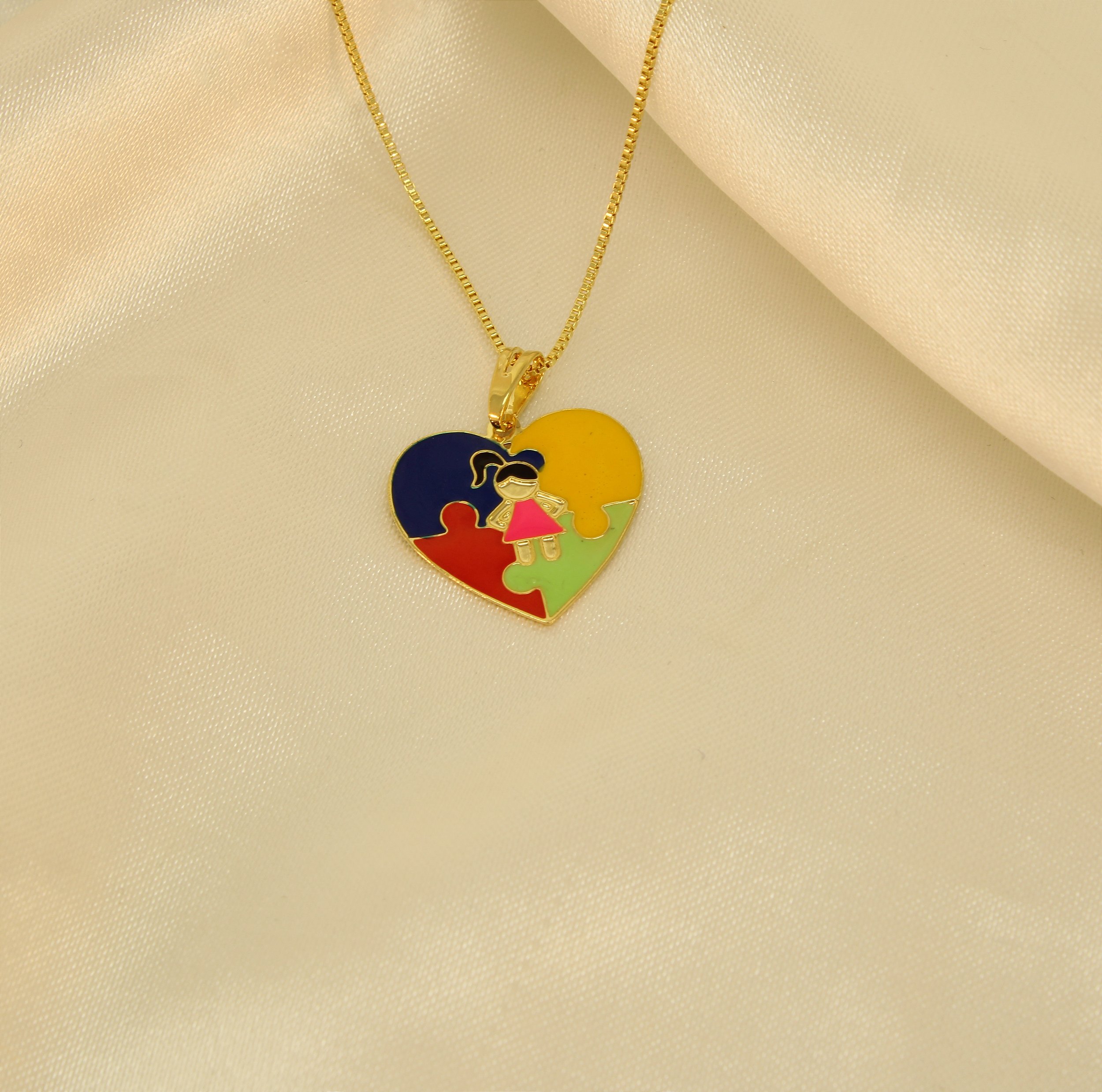 Gargantilha de Coração Símbolo do Autismo Menina Folheado a Ouro 18k