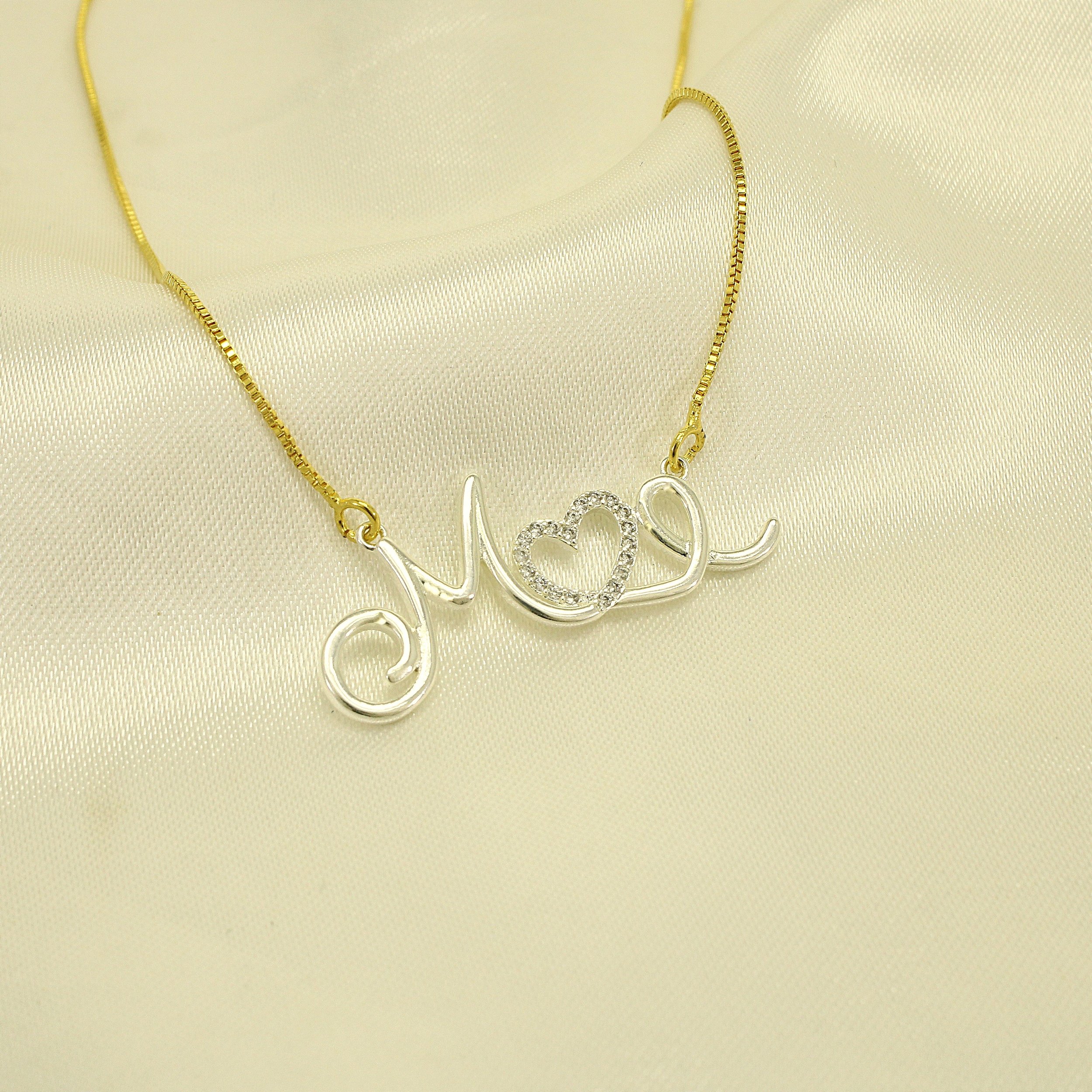 Gargantilha Escrito Mãe e Coração com Detalhe em Zircônia Banhado a Prata e Ouro 18k