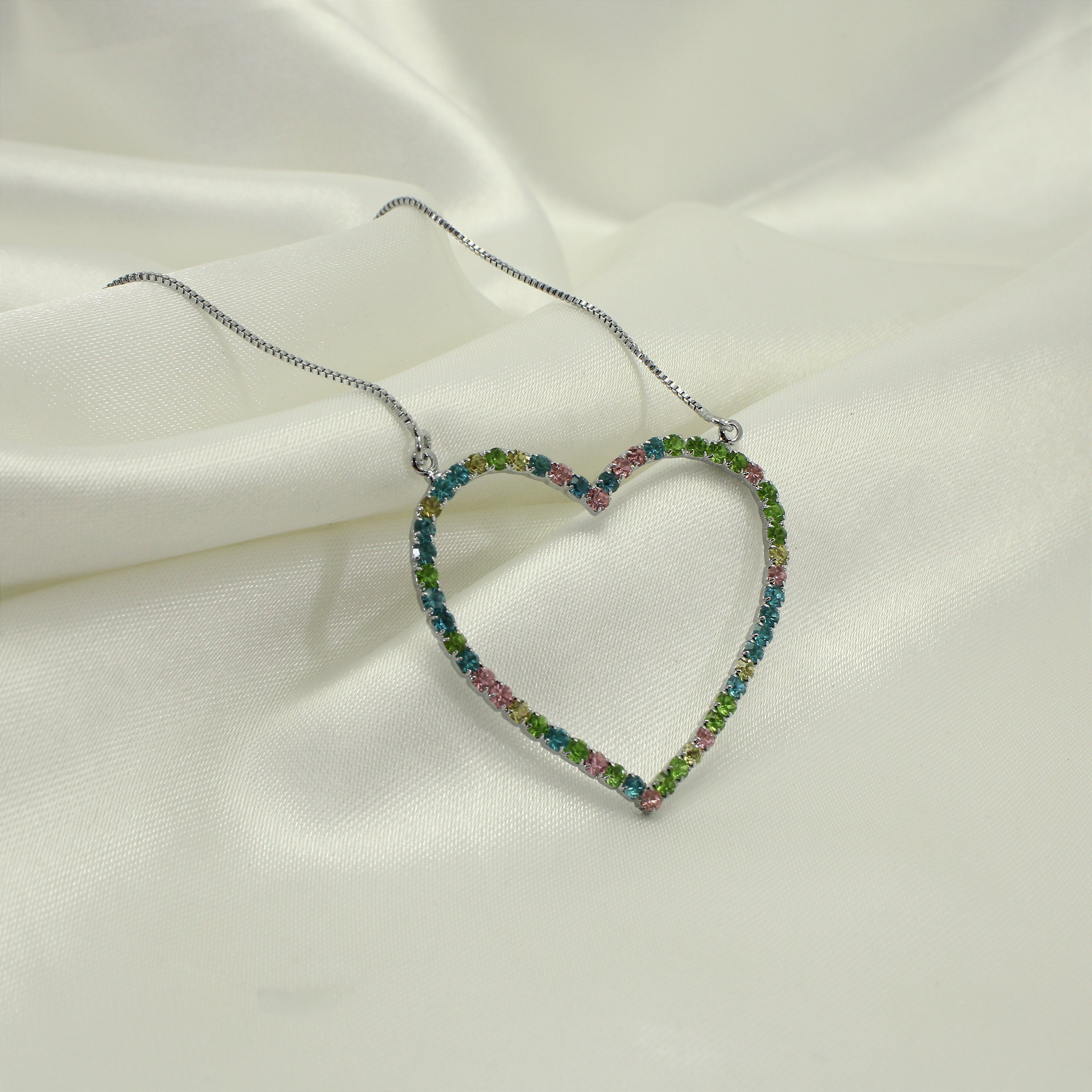 Gargantilha de Coração Cravejado em Zircônias Multicoloridas Banhado a Ouro Branco
