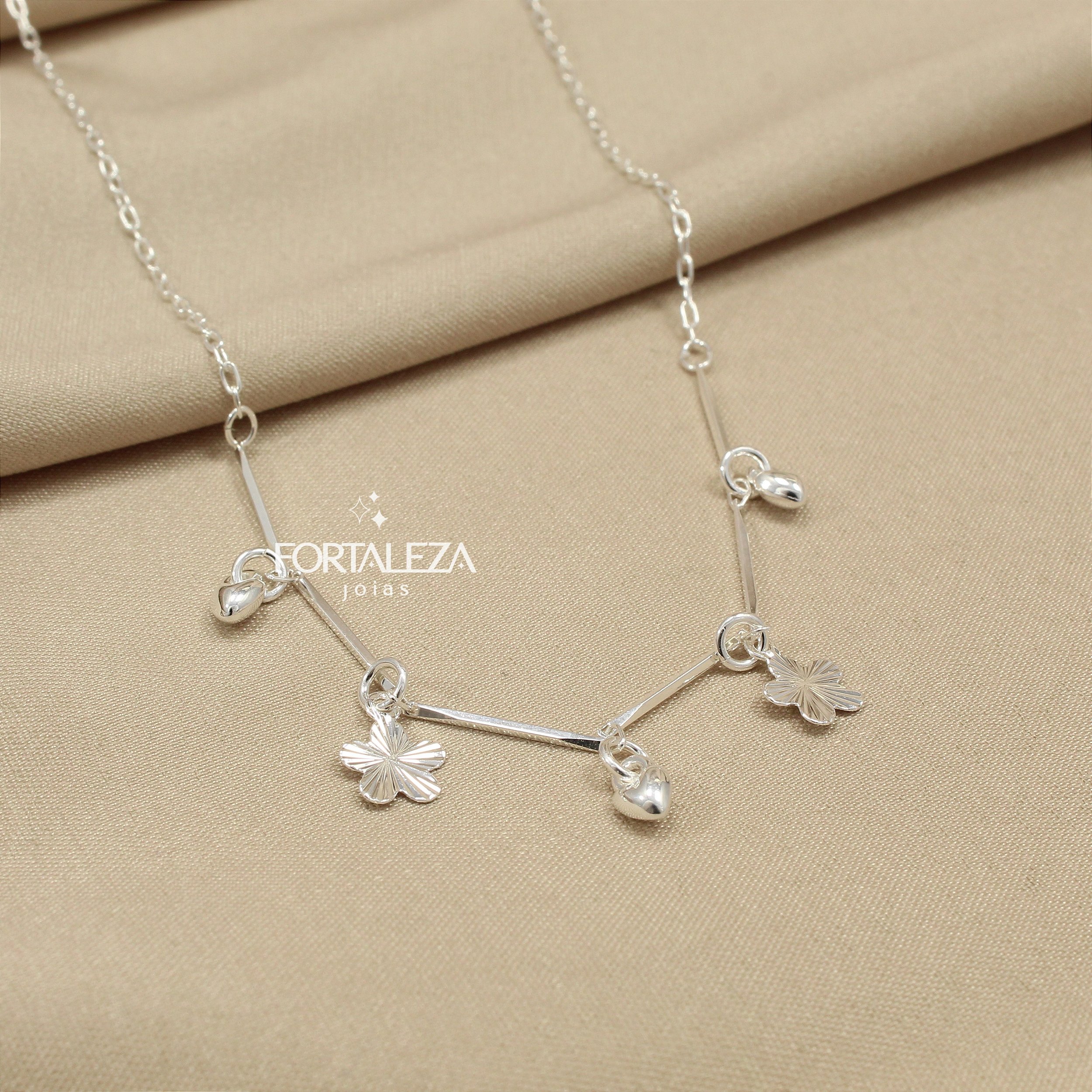 Gargantilha Flores Plissadas e Corações Abaulados Banhado a Prata 925