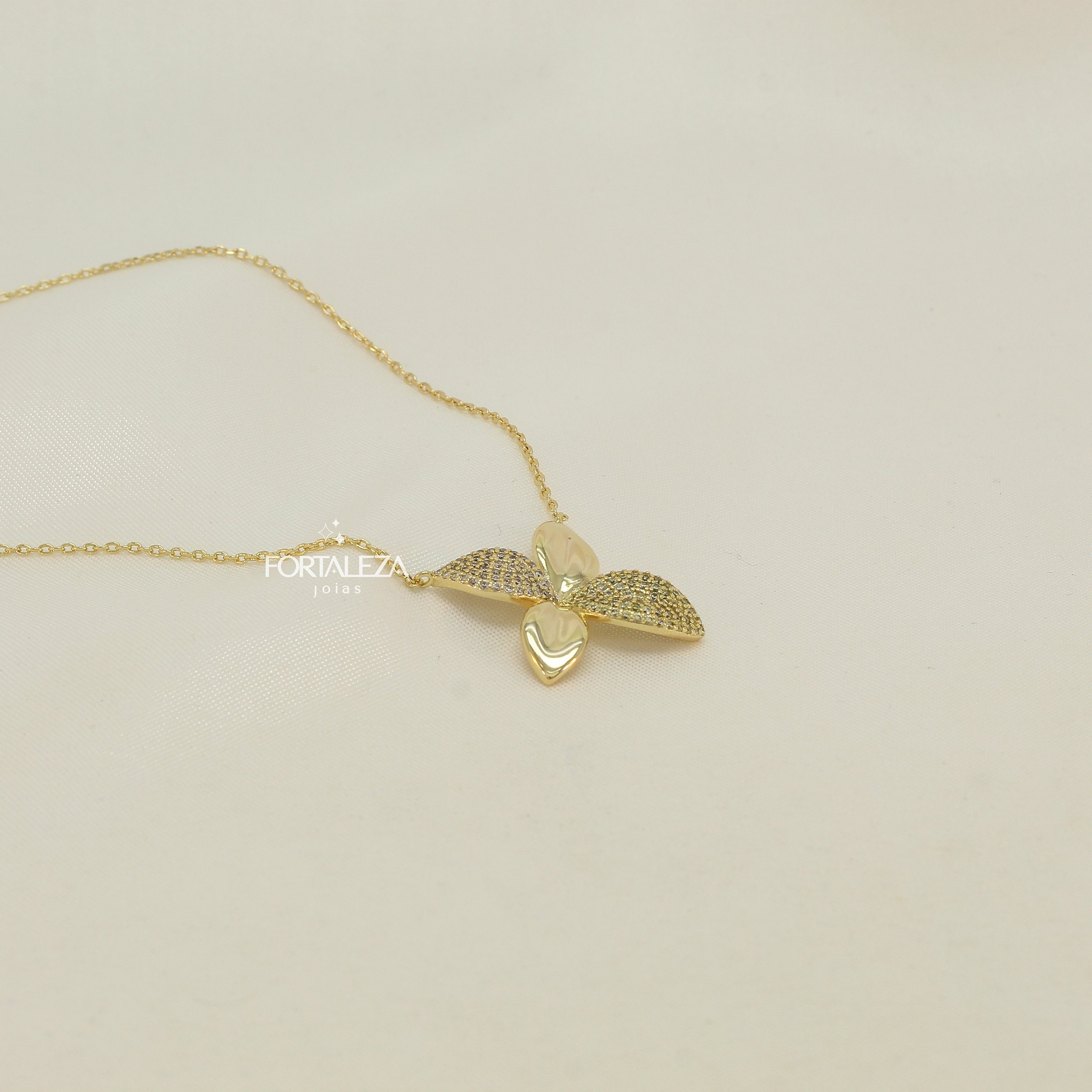 Gargantilha de Flor com Quatro Pétalas Cravejado com Zircônias Cristal Banhado a Ouro 18k