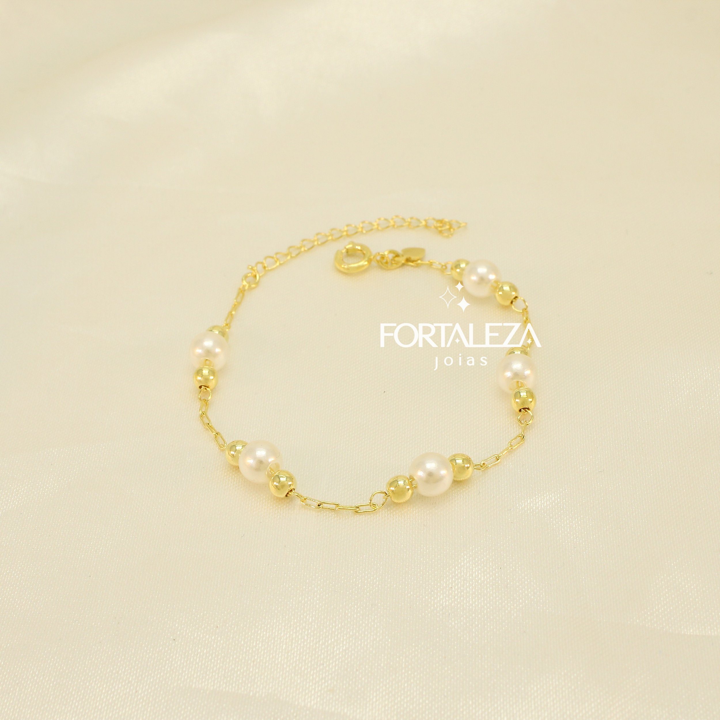 Pulseira de Pérolas e Bolinhas Banhado a Ouro 18k