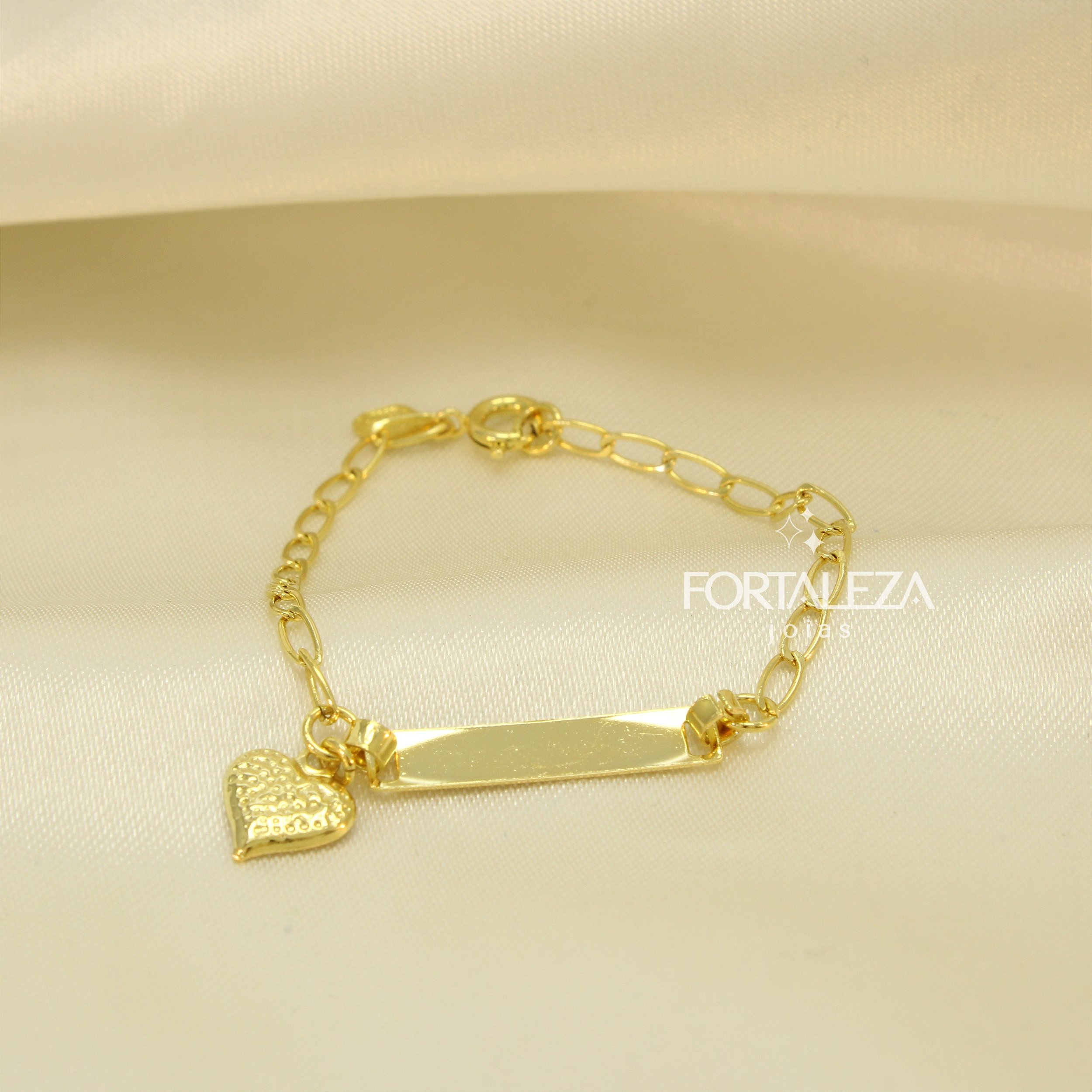 Pulseira com Plaquinha Lisa e Pingente de Coração Banhado a Ouro 18k