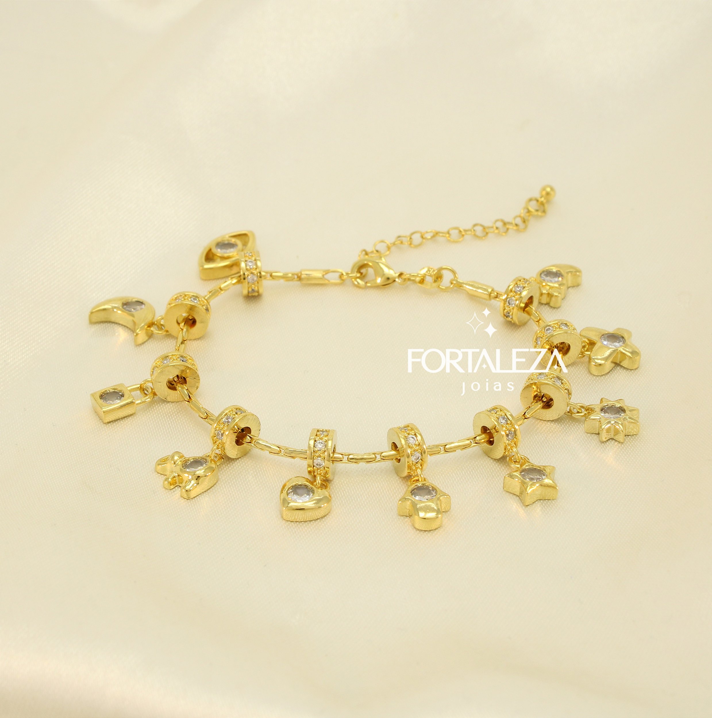 Pulseira de Berloques com Zircônia Cristal Banhado a Ouro 18k