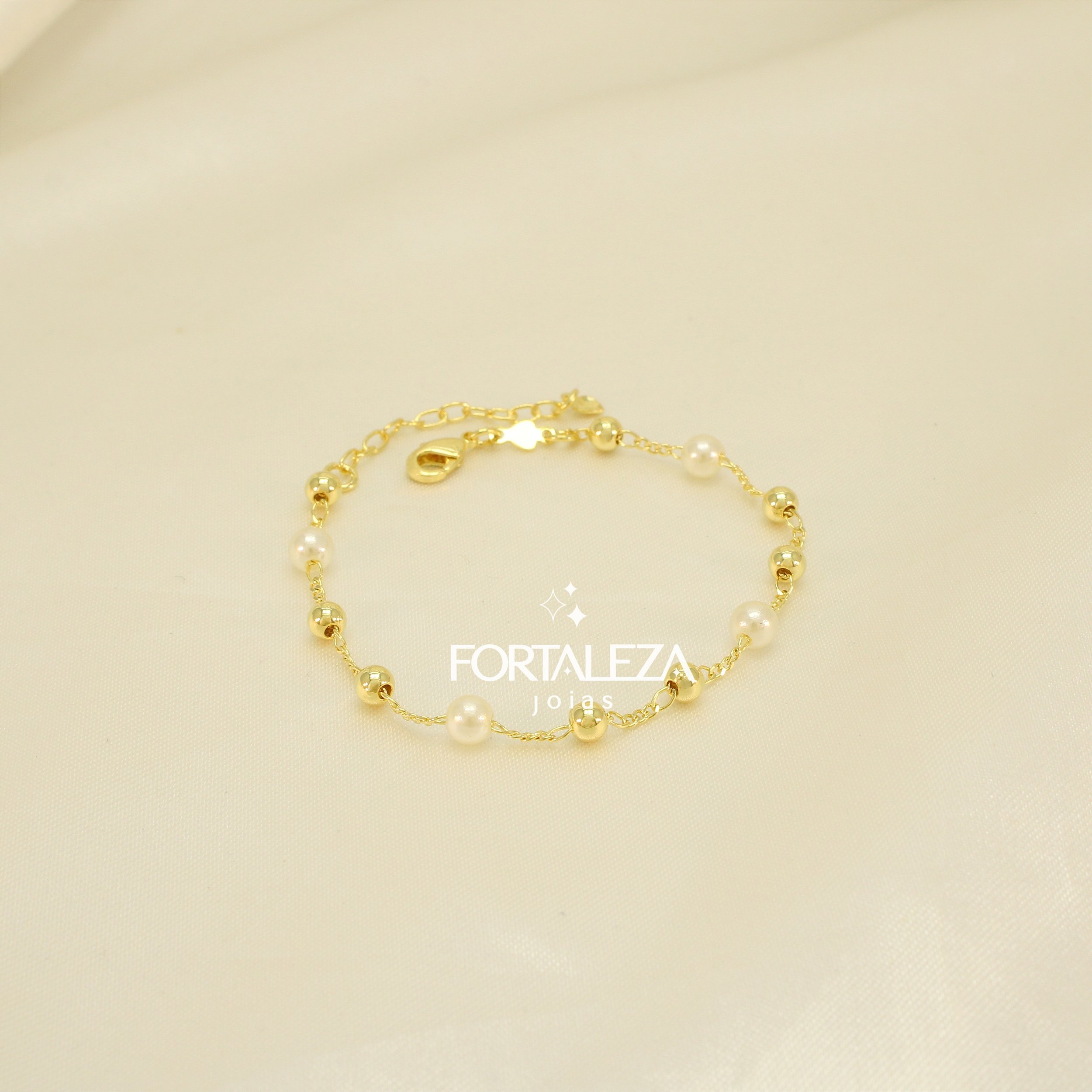 Pulseira de Pérolas e Bolinhas Polidas Banhado a Ouro 18k