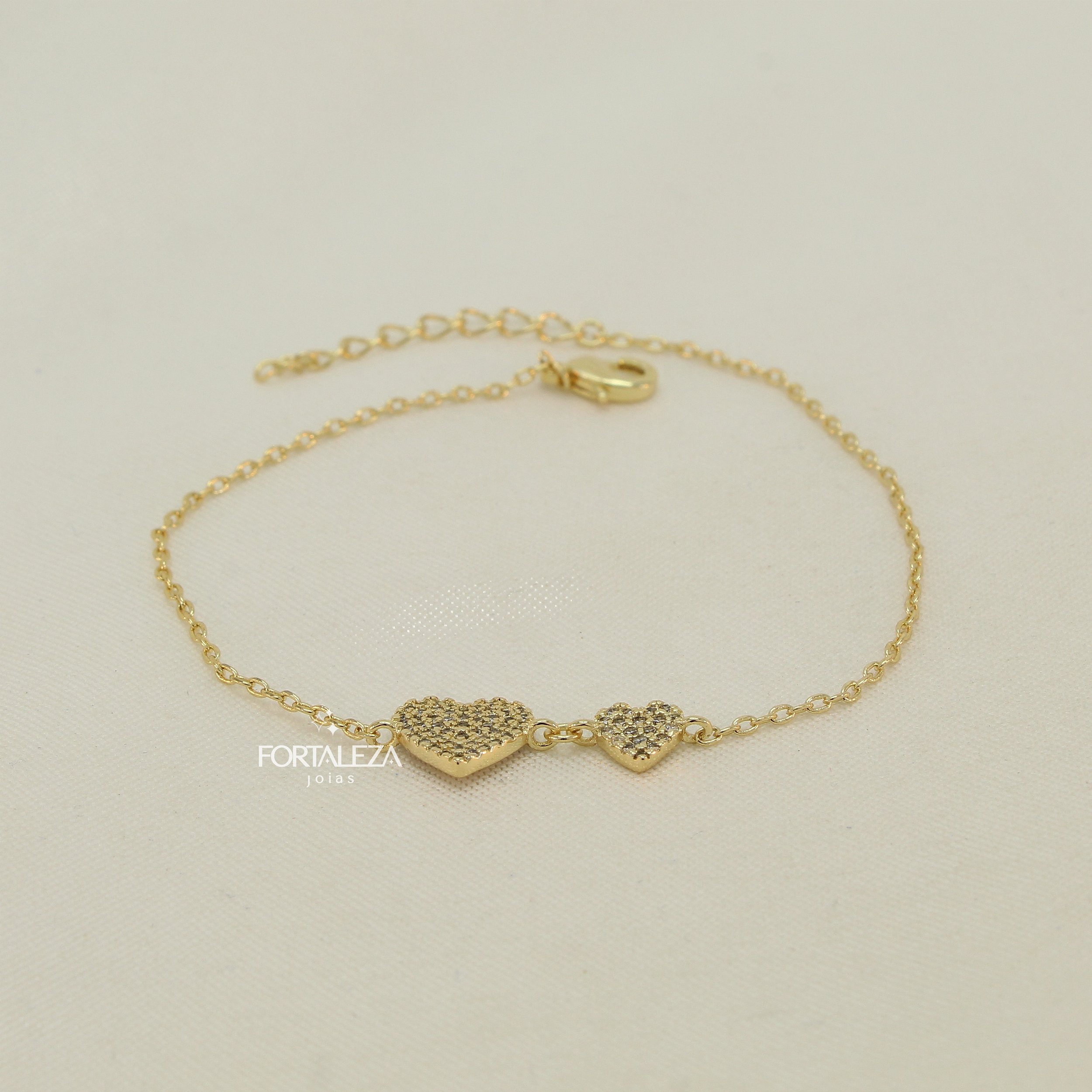 Pulseira com Duplo Coração Cravejado Banhado a Ouro 18k