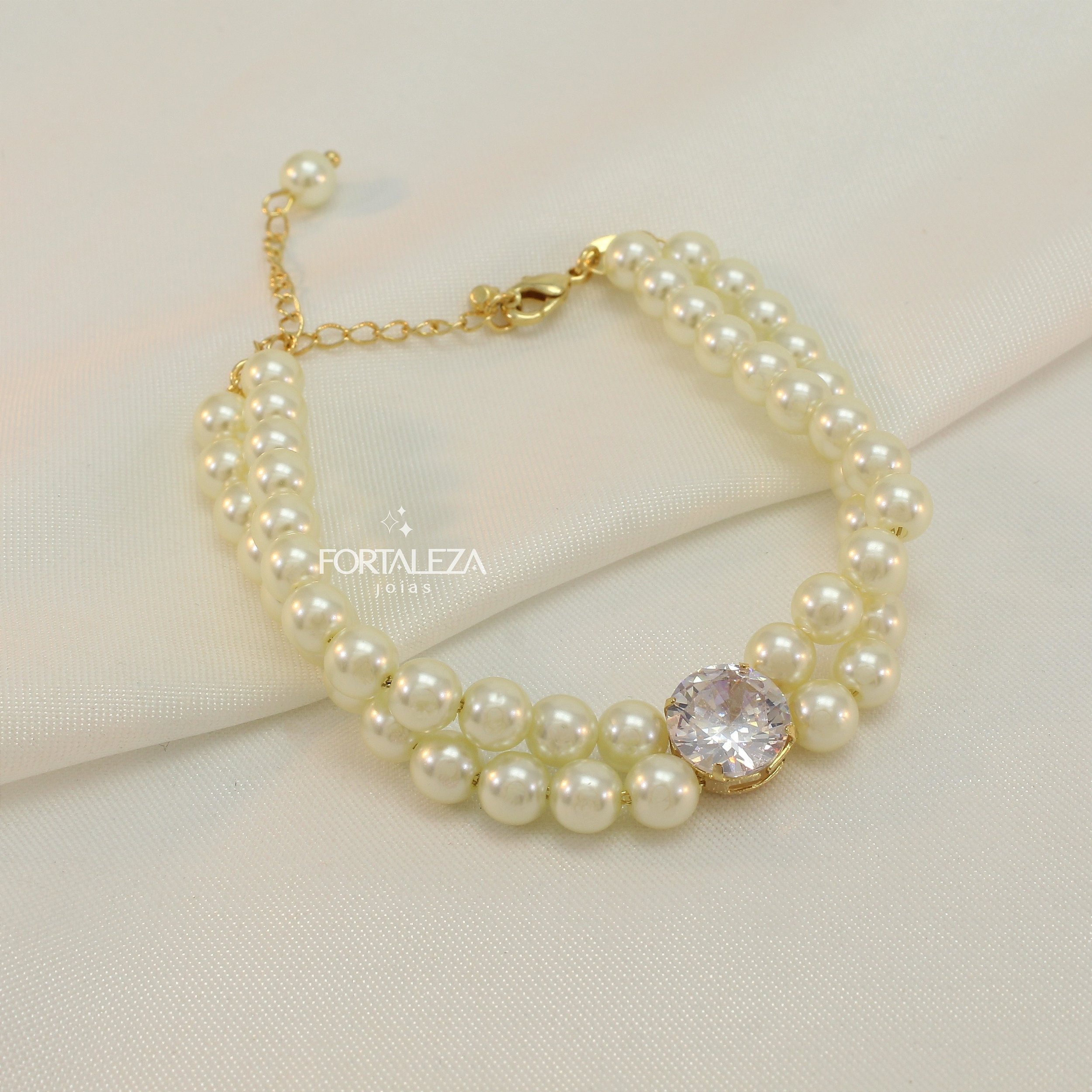 Pulseira Dupla de Pérolas com Pingente de Zircônia Cristal Banhado a Ouro 18k
